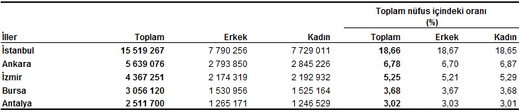 İstanbul'un nüfusu, bir önceki yıla göre 451 bin 543 kişi artarak 15 milyon 519 bin 267 kişiye ulaştı. Türkiye nüfusunun %18,66'sının ikamet ettiği İstanbul'u, 5 milyon 639 bin 76 kişi ile Ankara, 4 milyon 367 bin 251 kişi ile İzmir, 3 milyon 56 bin 120 kişi ile Bursa ve 2 milyon 511 bin 700 kişi ile Antalya izledi.