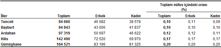 Tunceli, 84 bin 660 kişi ile en az nüfusa sahip olan il oldu. Tunceli'yi, 84 bin 843 kişi ile Bayburt, 97 bin 319 kişi ile Ardahan, 142 bin 490 kişi ile Kilis ve 164 bin 521 kişi ile Gümüşhane takip etti.