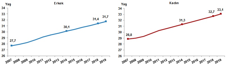 Türkiye'de 2018 yılında 32 olan ortanca yaş, 2019 yılında 32,4'e yükseldi. Cinsiyete göre incelendiğinde, ortanca yaşın erkeklerde 31,4'ten 31,7'ye, kadınlarda ise 32,7'den 33,1'e yükseldiği görüldü.