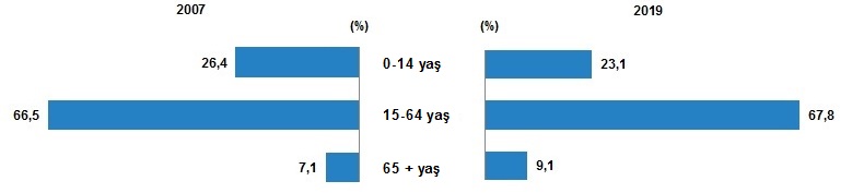 Çalışma çağı olarak tanımlanan 15-64 yaş grubundaki nüfusun oranı, 2007 yılında %66,5 iken 2019 yılında %67,8'e yükseldi. Diğer yandan çocuk yaş grubu olarak tanımlanan 0-14 yaş grubundaki nüfusun oranı %26,4'ten %23,1'e gerilerken, 65 ve daha yukarı yaştaki nüfusun oranı ise %7,1'den %9,1'e yükseldi.