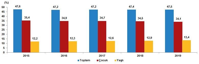 Ekonomik olarak aktif olan birey başına düşen çocuk sayısını ifade eden çocuk bağımlılık oranı, %34,5'ten, %34,1'e gerilerken, çalışan birey başına düşen yaşlı birey sayısını ölçen yaşlı bağımlılık oranı ise %12,9'dan %13,4'e yükseldi. Diğer bir ifadeyle, Türkiye'de 2019 yılında, çalışma çağındaki 100 kişi, 34,1 çocuğa ve 13,4 yaşlıya bakmaktadır.