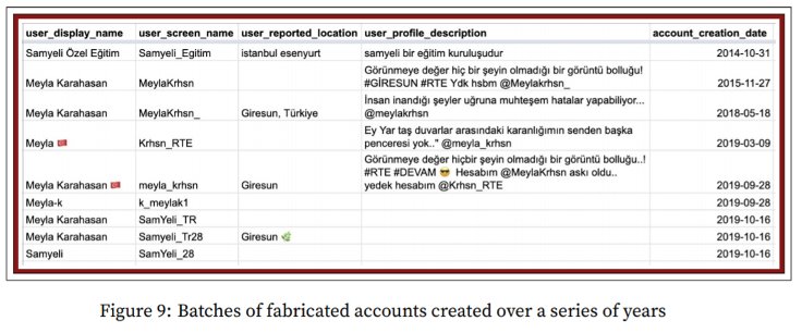 Raporda, kapatılan sahte hesaplardan bazılarının yerel AK Parti yöneticilerine, dijital pazarlama şirketlerine ve spor taraftarlarına ait gibi göründüğü, bir çoğunun ise açıkça sahte kişilikler olduğu belirtildi. Hesapların çoğunun çok az takipçisi bulunduğu ancak altısının 100 binin üzerinde takipçi sahibi olduğu bilgisi de verildi.