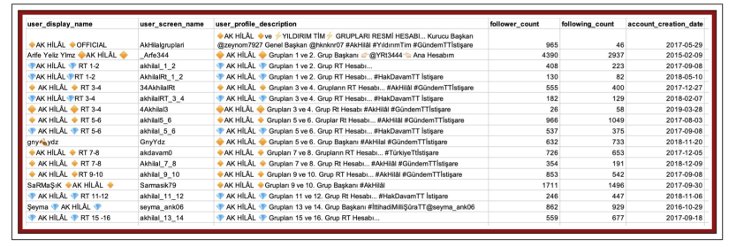 .Rapora göre, bugün kapatılan hesaplar arasında “son derece merkezi ve organize olan, AKP yanlısı retweet ağlarının” parçası olan onlarca hesap bulunuyor. Bu hesapların “aynı içeriği paylaştığı, hedef kitle inşa etme taktiklerini kullandığı ve etiketleri popülermiş gibi göstermeye çalıştıkları” belirtildi. Raporda, “Daha önceden araştırdığımız retweet ağlarının aksine, bugün kapatılan gruplar tamamen siyasiydi ve ticari etiketleri nadiren yeniden paylaştılar (belki de hiç paylaşmadılar)” denildi.