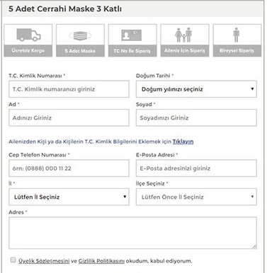 sitesinden duyurulacak formda yer alan T.C. kimlik no, ad-soyad, doğum tarihi alanları doldurularak ücretsiz maske siparişi verebilirsiniz.