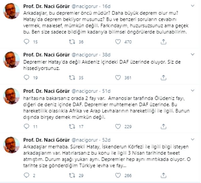 Bilim Akademisi Üyesi Prof. Dr. Naci Görür, Hatay'ın Yayladığı ilçesinde meydana gelen 4.7, 4.4 ve 4.0 büyüklüğündeki depremlerle ilgili Twitter hesabından paylaşım yaparak açıklamalarda bulundu.