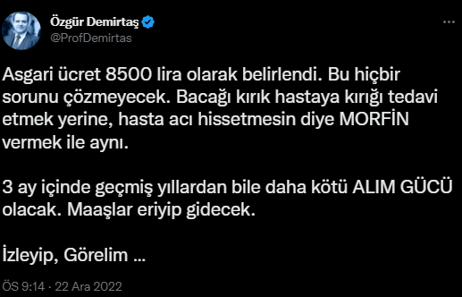 Asgari ücretin net 8 bin 506,80 lira olmasının ardından konuyu sosyal medya hesabından değerlendiren Sabancı Üniversitesi İşletme Fakültesi Finans Kürsü Başkanı Prof. Dr. Özgür Demirtaş şunları söyledi: