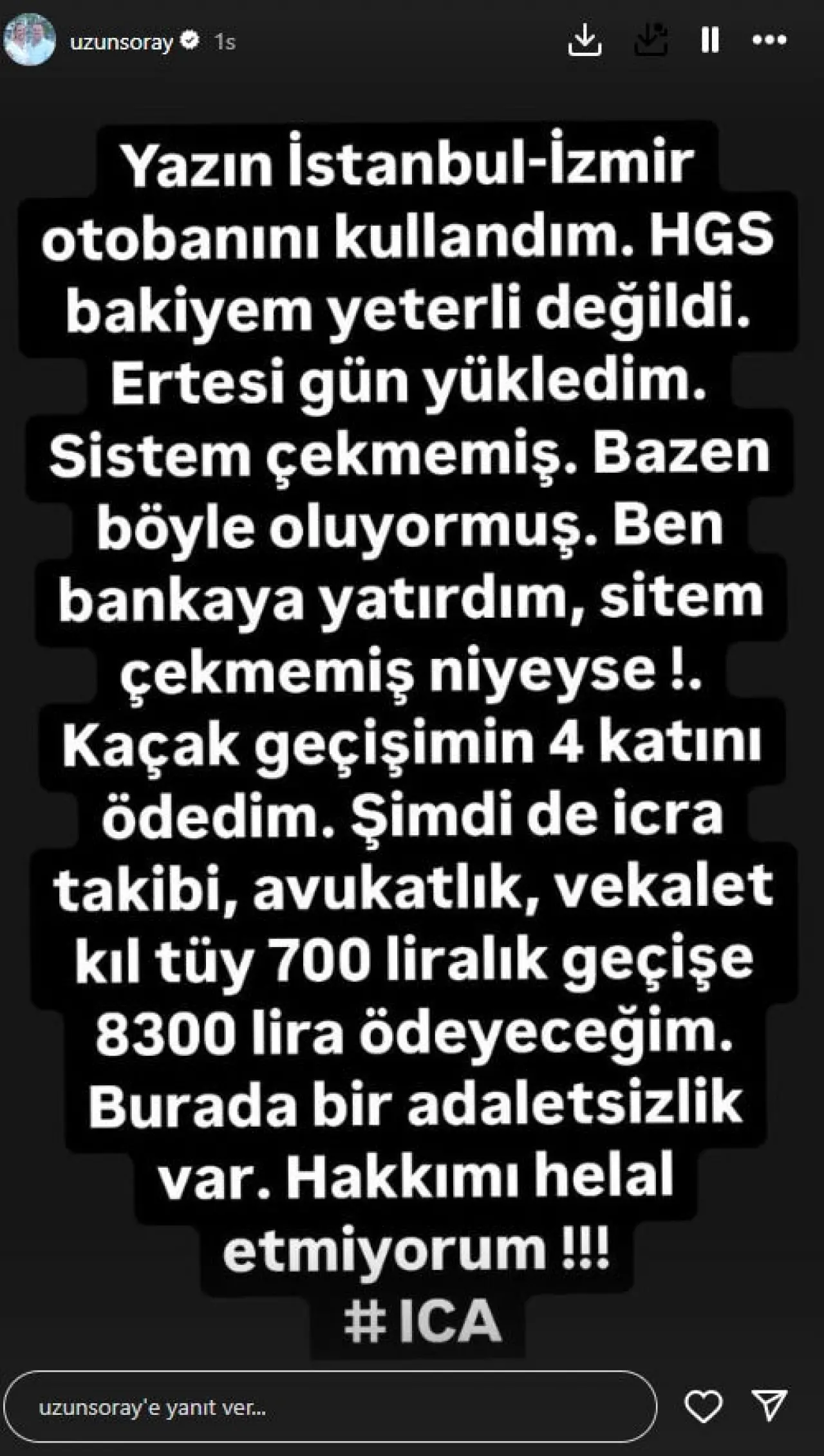 Şoray Uzun, Instagram hesabından yaptığı paylaşımda yaşadığı sorunu detaylarıyla anlattı. "Yazın İstanbul-İzmir otobanını kullandım. HGS bakiyem yeterli değildi. Ertesi gün yükledim ancak sistem çekmemiş." dedi.