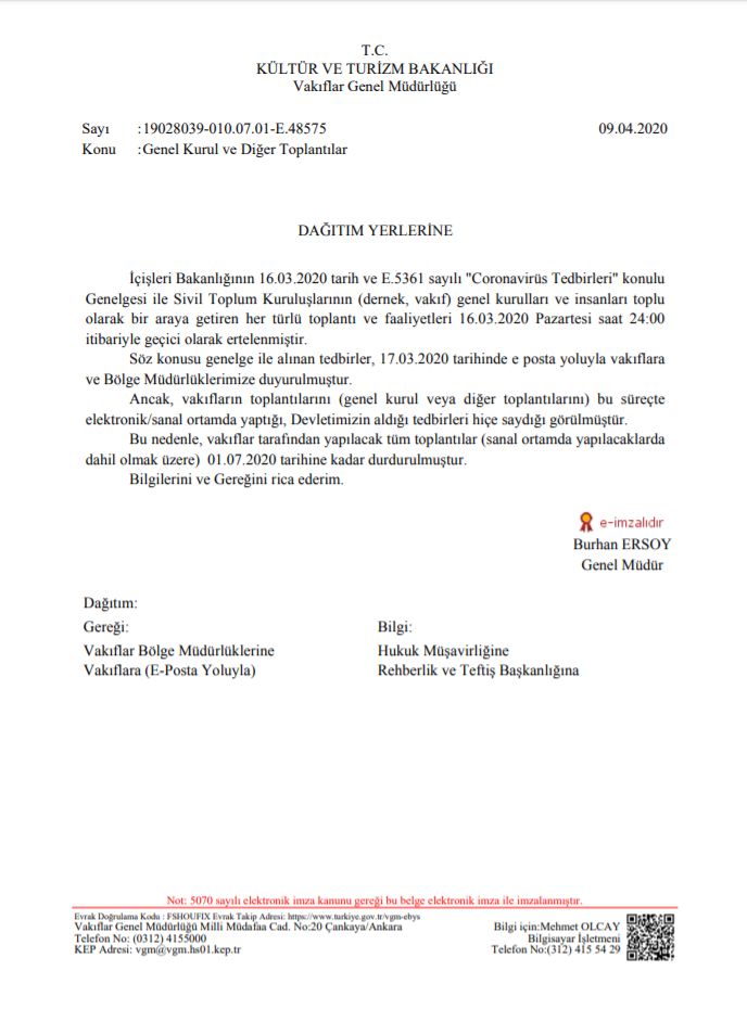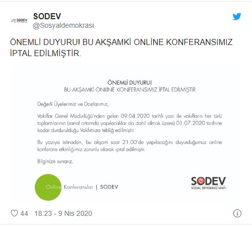 Vakıflar Genel Müdürlüğü, akşam saatlerinde vakıflara gönderdiği bir yazıyla tüm sanal toplantıların da genel toplantı yasağının bir parçası olduğunu tebliğ etti. Gelen tepkiler ve tablodaki bulanıklık sonucunda ikinci bir yazıyla sanal toplantı yasağının sadece seçimli genel kurulları kapsadığı belirtildi. Vakıflar Genel Müdürlüğü’nün yazısı üzerine pek çok kişi kara tepki gösterirken Sosyal Demokrasi Vakfı, bu akşam düzenleyeceği toplantıyı iptal ettiğini duyururken, Universus Sosyal Araştırmalar Merkezi ise yaptığı Twitter paylaşımıyla kararı tanımayacağını söyledi ve etkinlik duyurularına devam etti.