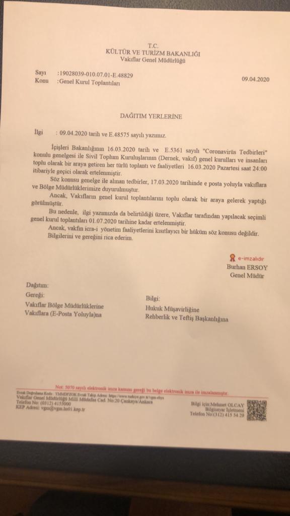 Belirsizlik ve tartışmalar devam ederken Vakıflar Genel Müdürlüğü ikinci yazıyı gönderdi. Yazıda, bir önceki karar değil 17 Mart’taki ilk karara atıf yapılırken vakıfların herhangi bir faaliyetinin ve yönetim kurullarının yetkilerine dokunmaksızın seçimli genel kurul toplantılarının iptal edildiği duyuruldu. Kararın alınma sebebinin bu süreçte vakıf defterlerinde yaşanabilecek usülsüzlükleri engellemek olduğu düşünülüyor. Fakat bir devlet kurumunun anlaşılması oldukça basit bir kararı iki farklı genelgeyle ifade edebilmesi soru işaretlerine yol açtı.