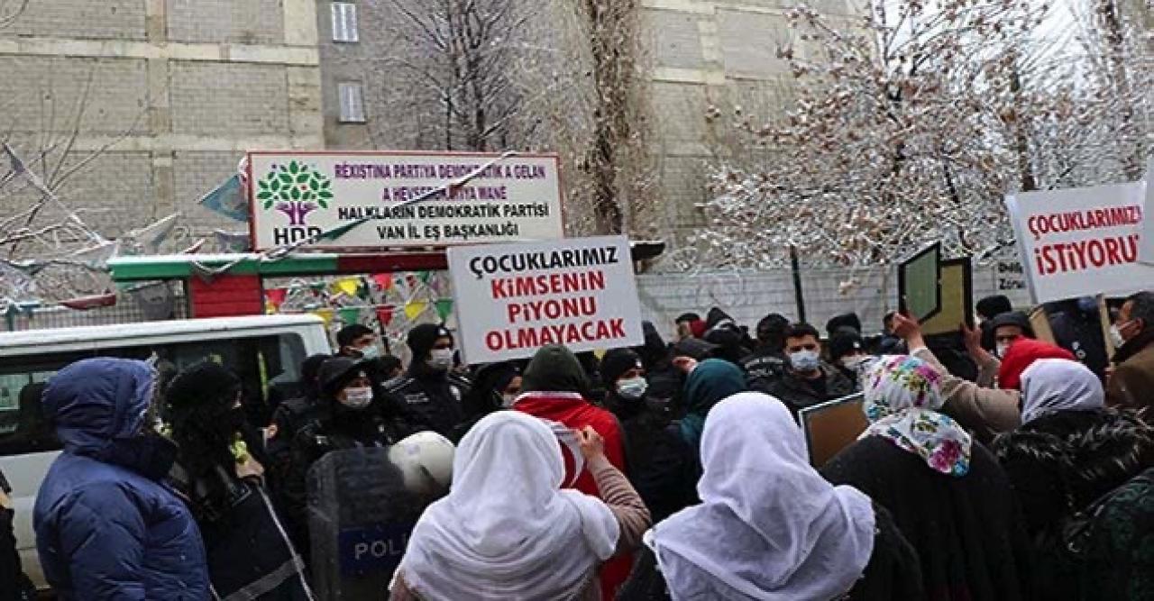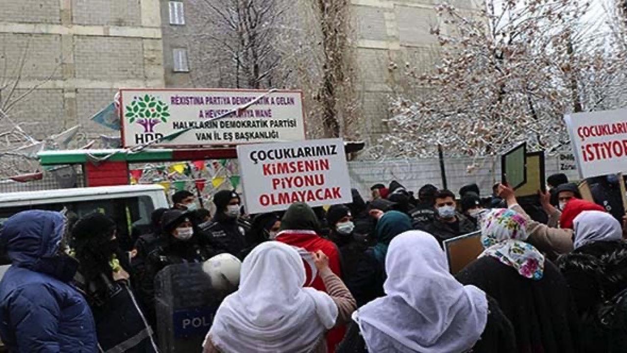 Van'da çocukları ve yakınları terör örgütü PKK tarafından kaçırılan ailelerin HDP il binası önündeki eylemleri üçüncü haftasında devam ediyor. Ellerinde Türk bayraklarıyla Cumhuriyet Caddesi'ndeki AVM önünde toplanan aileler, kar yağışına rağmen güvenlik önlemleri eşliğinde HDP il binasının önüne yürüdü. Burada, ellerinde çocuklarının ve yakınlarının fotoğrafları ile Türk bayraklarıyla 'Dağları kurtlara, kuşlara bırakın', 'Çocuklarımızı istiyoruz', 'Anneler nöbette', 'Artık yeter yakamızdan düşün', 'Çocuklarımız kimsenin piyonu olmayacak' yazılı dövizleri taşıyan aileler, bina önünde "Kahrolsun PKK, işbirlikçi HDP" sloganları attı. Parti binası bahçesinde toplanan HDP'lilerin ise sloganlar atarak, tef ve zılgıt ile sloganları susturmaya çalıştığı görüldü.