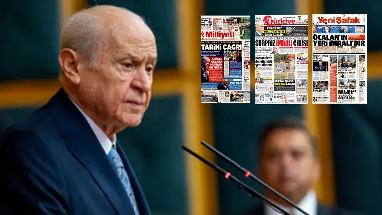 Hürriyet 'Bahçeli'den Öcalan'a tarihi çağrı', Türkiye gazetesi 'Bahçeli'den ezber bozan açıklama', Milliyet gazetesi 'Bahçeli'den ezber bozan çıkış', Posta gazetesi 'Bahçeli'den ezber bozan öneri' benzer manşetlerle öne çıkarken Yeni Şafak gazetesinin karşıt bir başlığa yer vermesi dikkat çekti.