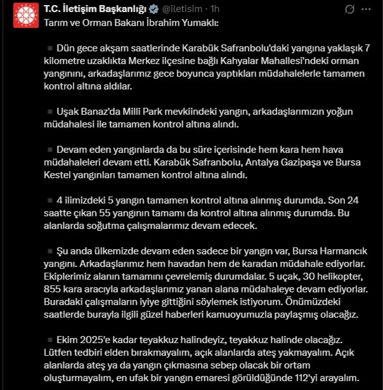 Şu anda Türkiye genelinde yalnızca Bursa’nın Harmancık ilçesinde çıkan orman yangınının sürdüğünü açıklayan Bakan Yumaklı, bölgeye yönelik hava ve kara müdahalesinin aralıksız devam ettiğini ifade etti.