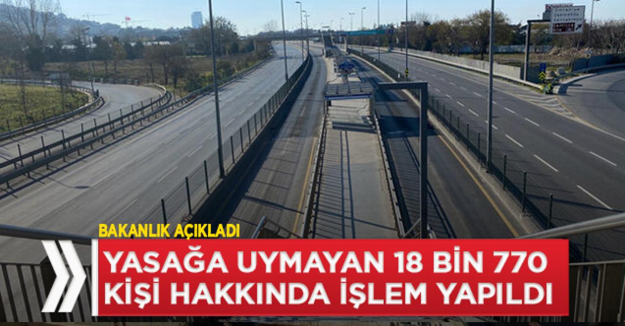 "31 ilimizde toplam 63 milyon 640 bin vatandaşımız sokağa çıkma yasağı kapsamında evlerinde kalarak alınan karara yüksek bir oranda uyum sağlamıştır. Ancak bazı illerimizde az sayıda da olsa alınan kararlara uymayan vatandaşlarımıza Umumi Hıfzıssıhha ve TCK'nın ilgili maddeleri kapsamında adli ya da idari işlem uygulanmıştır. Bu kapsamda sokağa çıkma yasağı başladığı andan itibaren bu kuralı ihlal eden toplam 18 bin 770 kişiye adli ya da idari işlem gerçekleştirilmiştir. Vatandaşlarımıza, koronavirüs salgını ile mücadele kapsamında aldığımız tedbirlere, göstermiş oldukları duyarlı yaklaşımdan dolayı teşekkür ederiz."