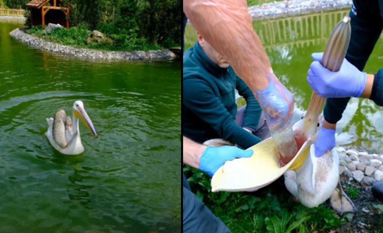 Görevlilerin durumu fark etmesi üzerine doğal yaşam parkındaki veterinerler, pelikana müdahalede bulundu. Pelikanın midesindeki pet şişe çıkarıldı.