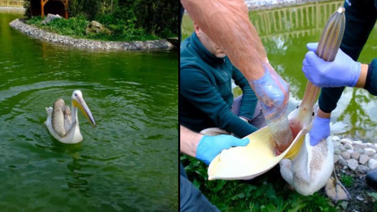 DHA- Kartepe ilçesinde bulunan doğal yaşam parkı Ormanya'daki bir pelikan, ziyaretçi tarafından atıldığı tahmin edilen pet şişeyi yuttu.