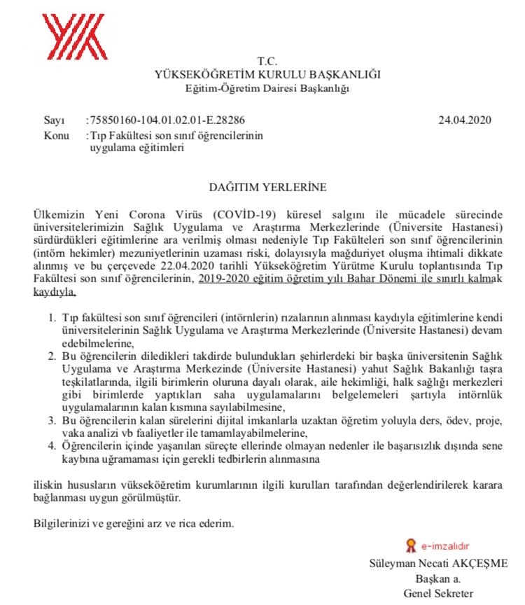Doktor adayı öğrencilerin uygulamalı eğitimlerinin yaz aylarına kalmasının; mezuniyetlerinin uzaması riski, TUS'a girememe ve mağduriyet ihtimalini de barındırdığından, konunun Yükseköğretim Yürütme Kurulu toplantısında ele alındığı belirtilen yazıda, bu kapsamda, tıp fakültelerindeki uygulama eğitimlerinin büyük bir kısmının tamamlandığı da dikkate alınarak 2019-2020 eğitim öğretim yılı bahar dönemi ile sınırlı kalmak kaydıyla tıp fakültesi son sınıf öğrencilerine ilişkin yeni kararlar alındığı belirtildi.