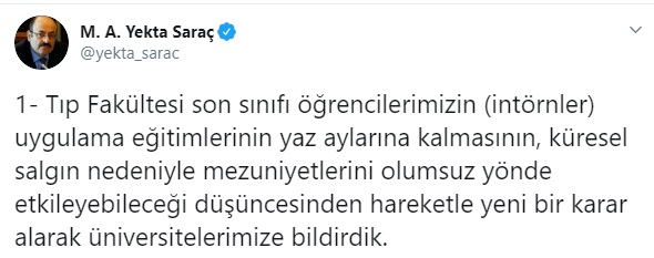 YÖK Başkanı Prof. Dr. M. A. Yekta Saraç, haberi Twitter hesabından duyurdu. Saraç, "Tıp Fakültesi son sınıfı öğrencilerimizin (intörnler) uygulama eğitimlerinin yaz aylarına kalmasının, küresel salgın nedeniyle mezuniyetlerini olumsuz yönde etkileyebileceği düşüncesinden hareketle yeni bir karar alarak üniversitelerimize bildirdik."ifadelerini kullandı.