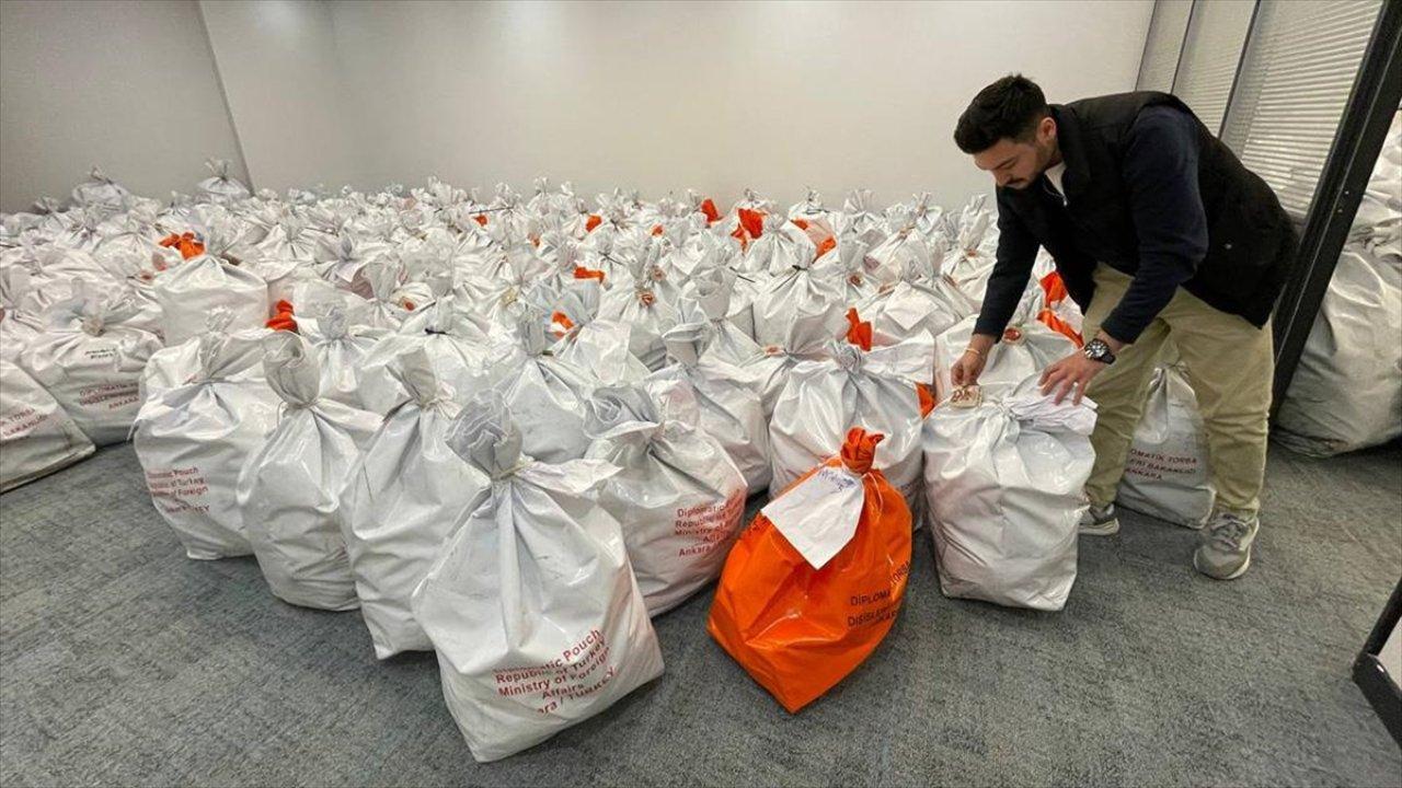 AA - Yurt dışı temsilciliklerdeki oy kullanma işlemi 9 Mayıs'ta tamamlandı. Kullanılan oyların bulunduğu çuvallar, sandık ve seçim görevlilerinin gözetiminde mühürlendikten sonra kurye ve siyasi parti temsilciler eşliğinde Türk Hava Yollarının (THY) tarifeli uçaklarıyla İstanbul Havalimanı'na getirildi.