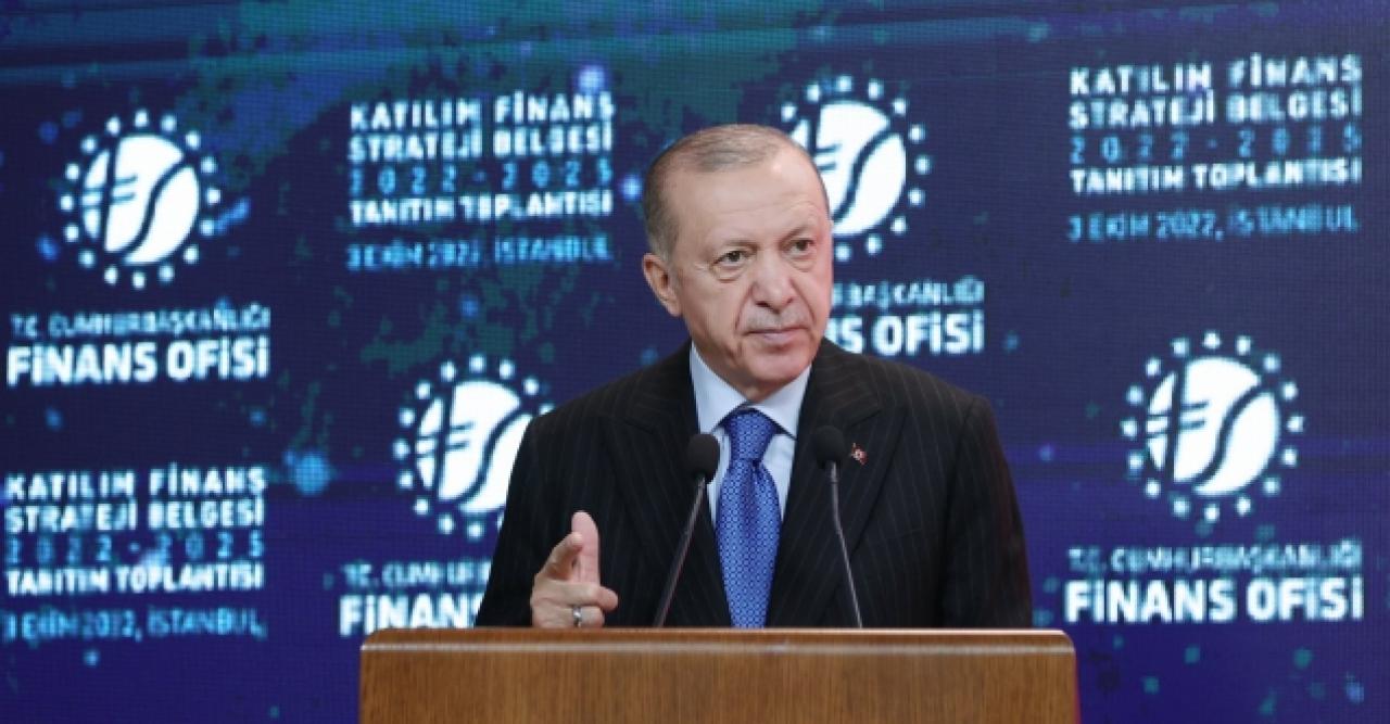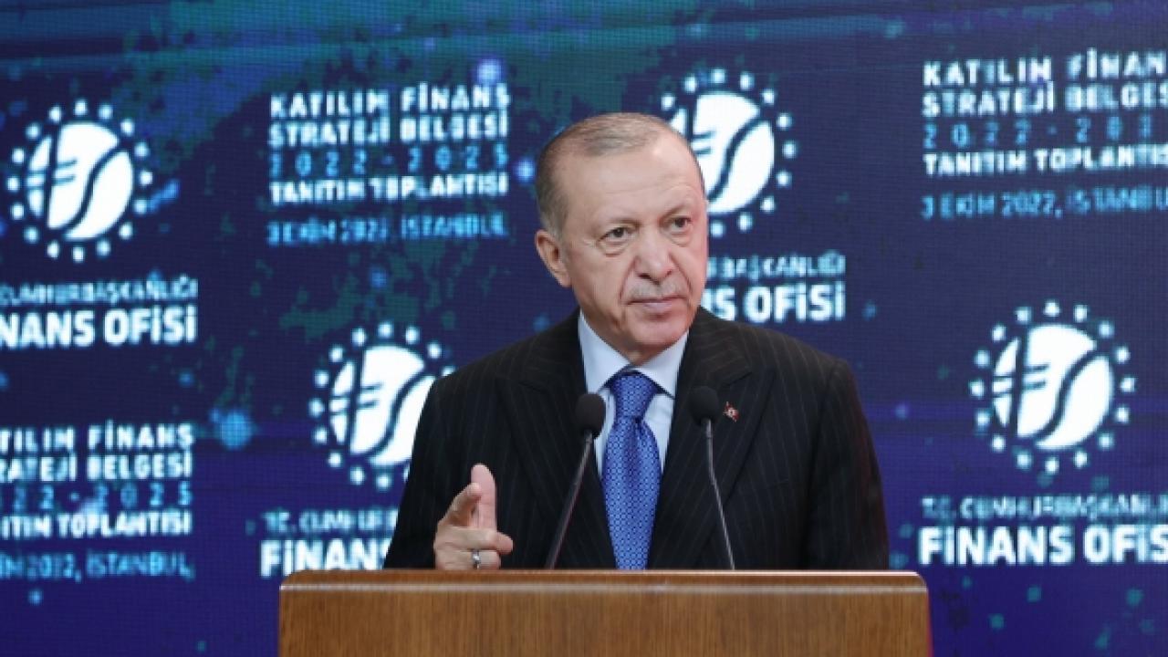 Cumhurbaşkanı Recep Tayyip Erdoğan, Dolmabahçe Ofisi'nde düzenlenen Katılım Finans Strateji Belgesi Tanıtım Toplantısı'nda davetlilere hitap etti. Katılım Finans Strateji Belgesi'nin tüm ilgili kesimler için hayırlara vesile olmasını temenni eden Erdoğan, "Strateji belgesinin hazırlanmasında emeği geçen Finans Ofisimiz başta olmak üzere herkesi tebrik ediyorum. Türkiye'nin her alanda olduğu gibi ekonomide de hedeflerini küresel ligin en üst sıralarına çıkarmak için böyle bir süreçte bu tür çalışmaların çok daha anlamlı olduğuna inanıyorum." diye konuştu. Cumhurbaşkanı Erdoğan, salgının ve savaşın tetiklediği enerji ve emtia fiyatlarındaki artışın derinleştirdiği küresel ekonomik krizin, gelişmiş ülkeler başta olmak üzere tüm ekonomileri derinden etkilediği bir dönemden geçildiğini söyledi.