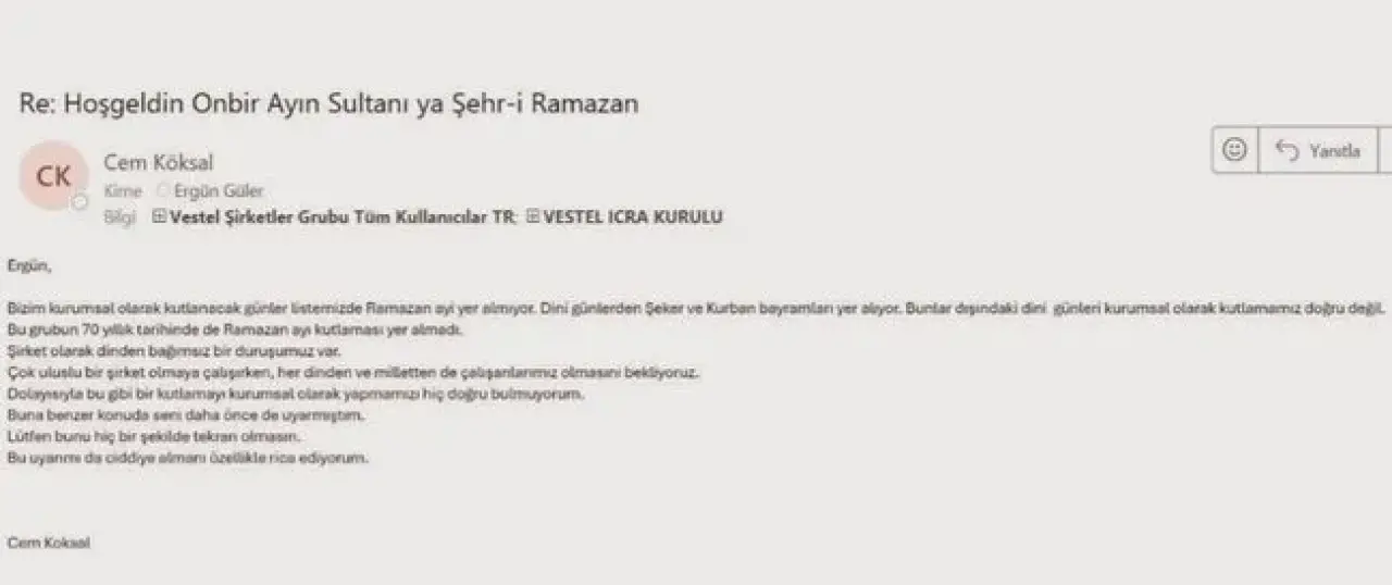 Ancak, Vestel’in bağlı olduğu Zorlu Holding CEO’su Cem Köksal, Ergün Güler’in mesajına tepki göstererek, şirkette Ramazan ayının kutlanmasının kurumsal bir gelenek olmadığını iddia etti. "70 Yıllık Tarihimizde Ramazan Kutlaması Yok" Cem Köksal, tüm çalışanların görebileceği şekilde yazdığı cevabi mesajında şu ifadelere yer verdi: "Ergün, bizim kurumsal olarak kutlanacak günler listemizde Ramazan ayı yer almıyor. Dini günlerden yalnızca Şeker ve Kurban bayramları var. Bunlar dışındaki dini günleri kurumsal olarak kutlamamız doğru değil. 70 yıllık tarihimizde Ramazan ayı kutlaması olmadı. Şirket olarak dinden bağımsız bir duruşumuz var."