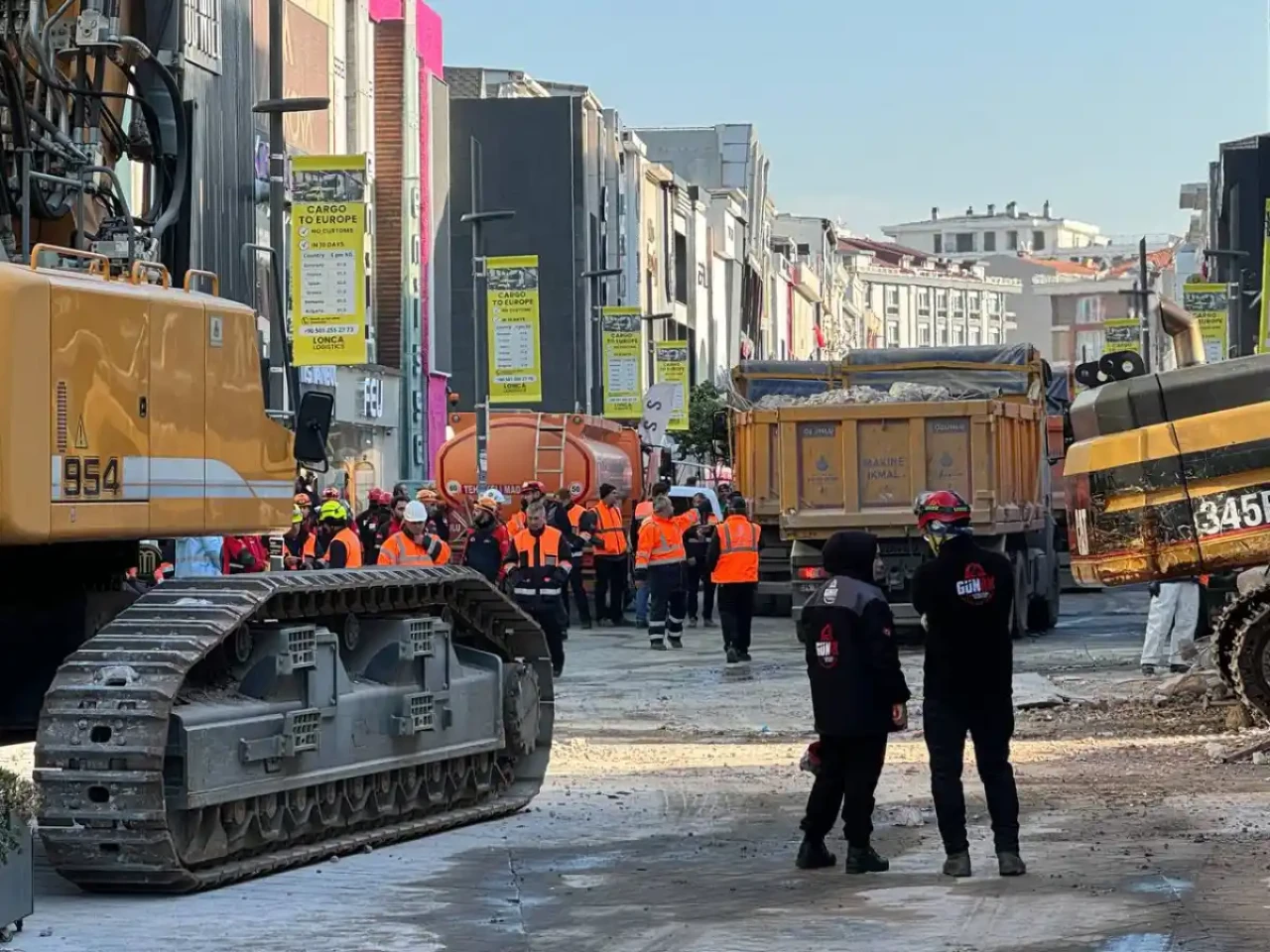 Polis ekiplerinin güvenlik önlemi aldığı bölgede cadde trafiğe kapatılırken, enkaz altında kalan işçinin yerinin tespit edilebilmesi için zaman zaman dinleme cihazları ve arama kurtarma köpeği de kullanılıyor.