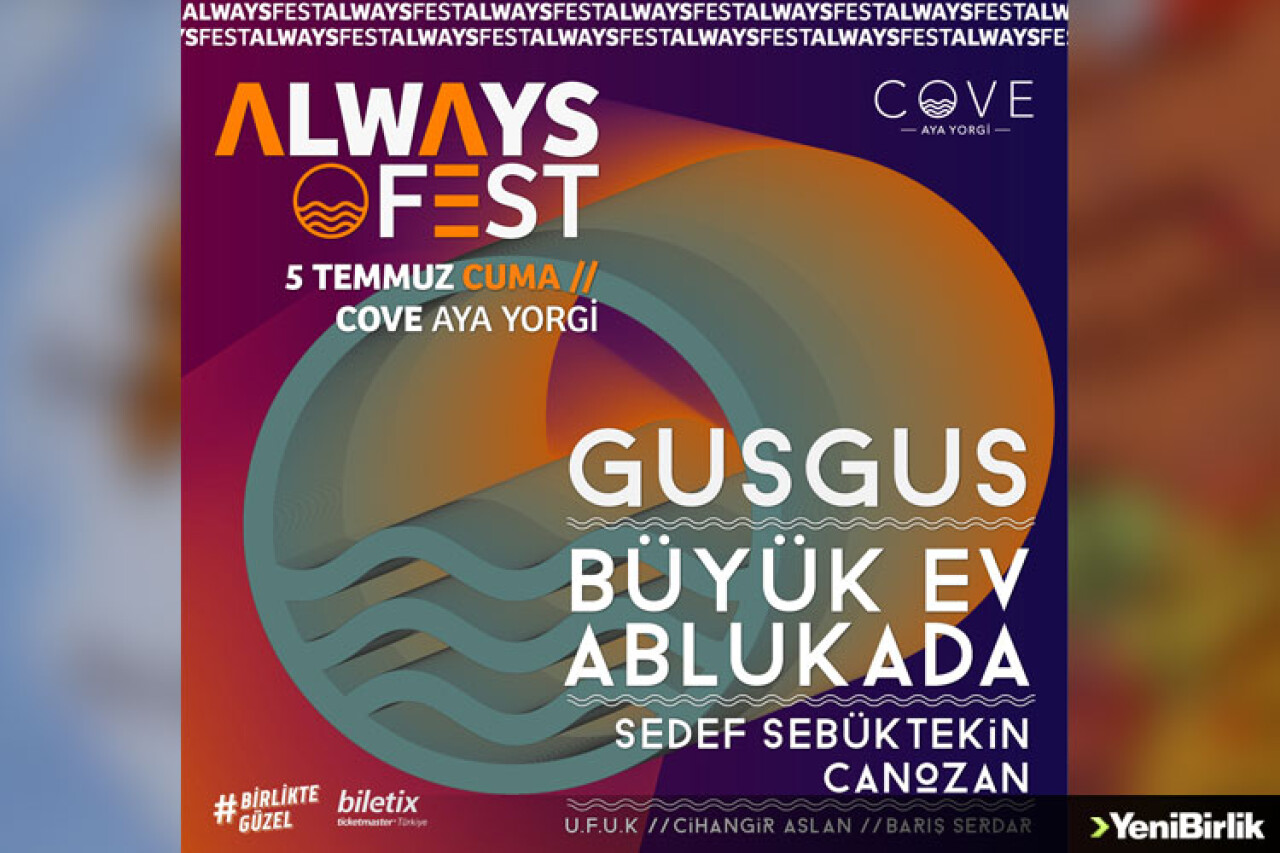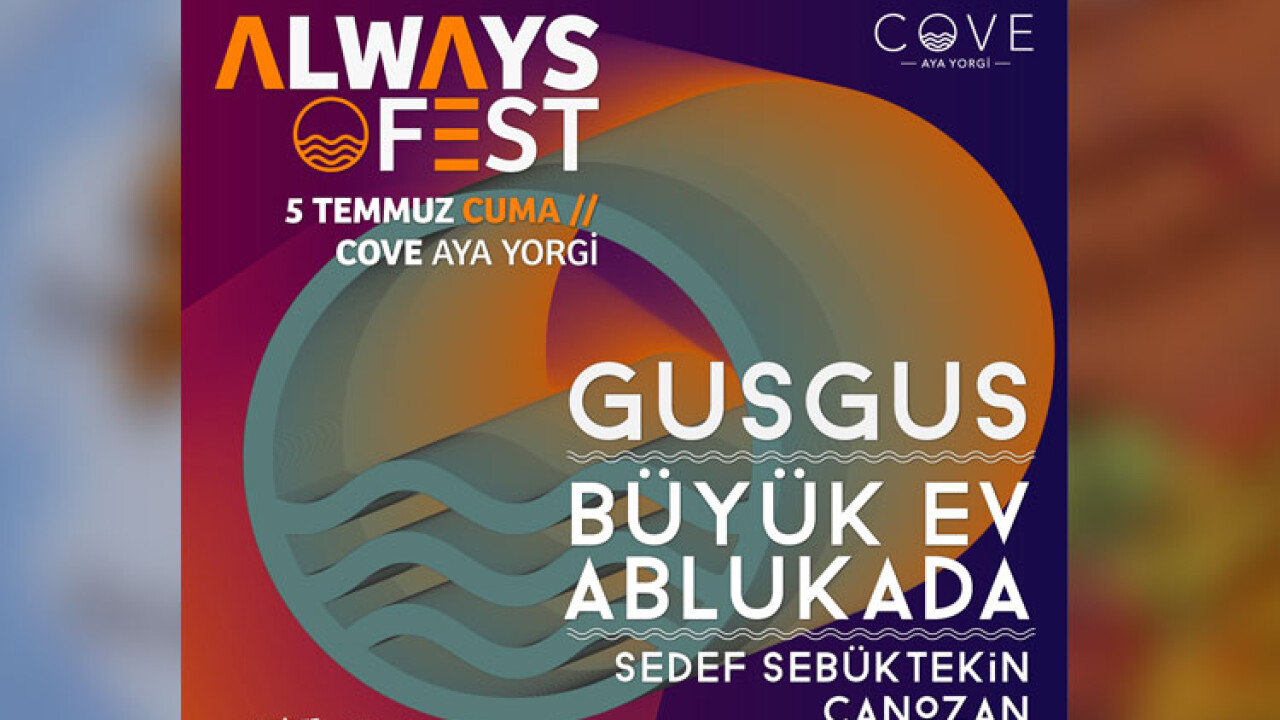 Cove Aya Yorgi, tüm yazı eğlence ve renklerle dolduracak AlwaysFest Festivali'nin ilkini 5 Temmuz'da İzlanda'nın ünlü gruplarından GusGus ile yerli sahnenin önemli isimlerinden Büyük Ev Ablukada, Sedef Sebüktekin, Can Ozan, U.F.U.K, Cihangir Aslan ve Barış Serdar gibi birbirinden başarılı isimler ile gerçekleştirecek.