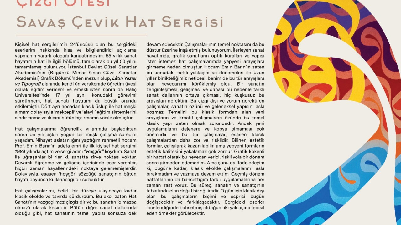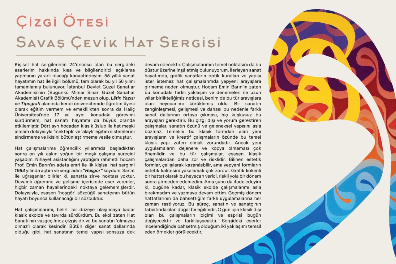 Günümüz hat sanatının önemli isimlerinden Savaş Çevik’in ‘’Çizgi Ötesi’’ hat sergisi 23 Mart Cumartesi günü saat 15.00’de Nevmekan Sahil Galeri’de açılacak.