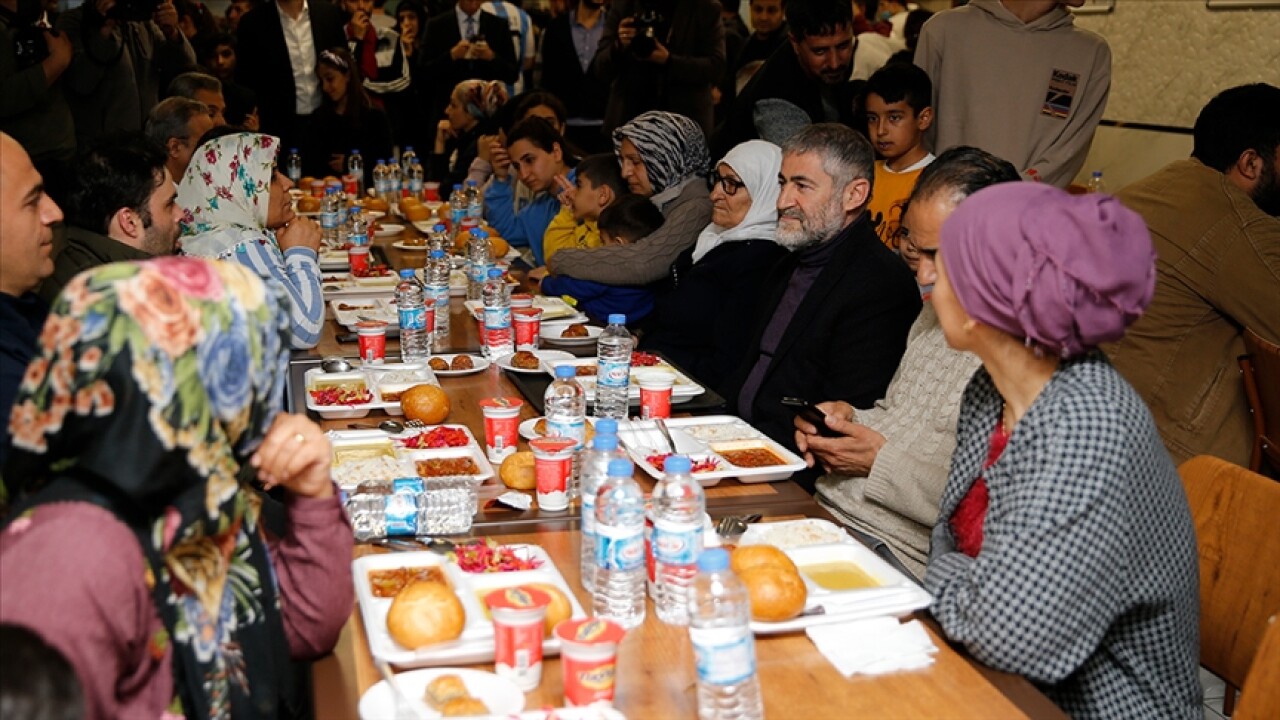 Depremzedelerle yemek sırasına giren Nebati, iftar vaktinin gelmesiyle orucunu açtı.