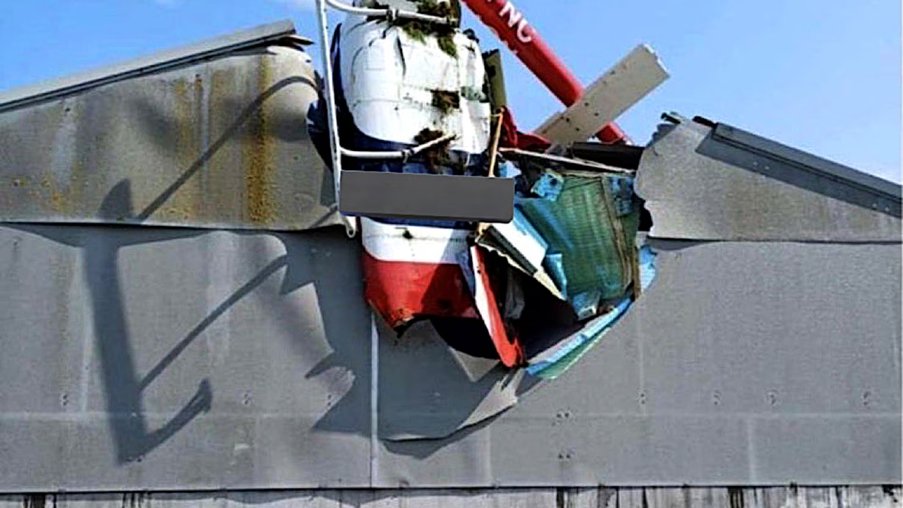 RTÉ internet sitesinde yer alan bir fotoğrafta helikopterin bir çiftlik binasının çatısı gibi görünen bir yere gömüldüğü görülüyor.