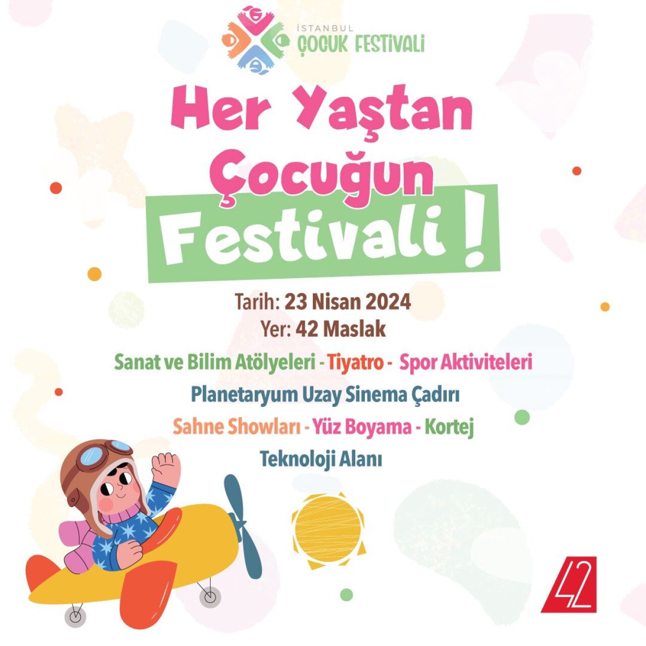 Festivalde, Deniz Alter, Çağrı Odabaşı gibi isimlerin yanı sıra Sincap Kitap, Zuhal Müzik, Cadence gibi markalar da çeşitli atölyeler gerçekleştirecek. 23 Nisan Salı günü saat 10:30-18:30 arasında gerçekleşecek olan festivalde; çocuklar gibi doyasıya eğlenerek, çocuklarınızla birlikte atölyelerde yeni bilgi ve beceriler kazanarak unutulmaz bir bayram geçirmek için sizi 42’ye bekliyoruz.