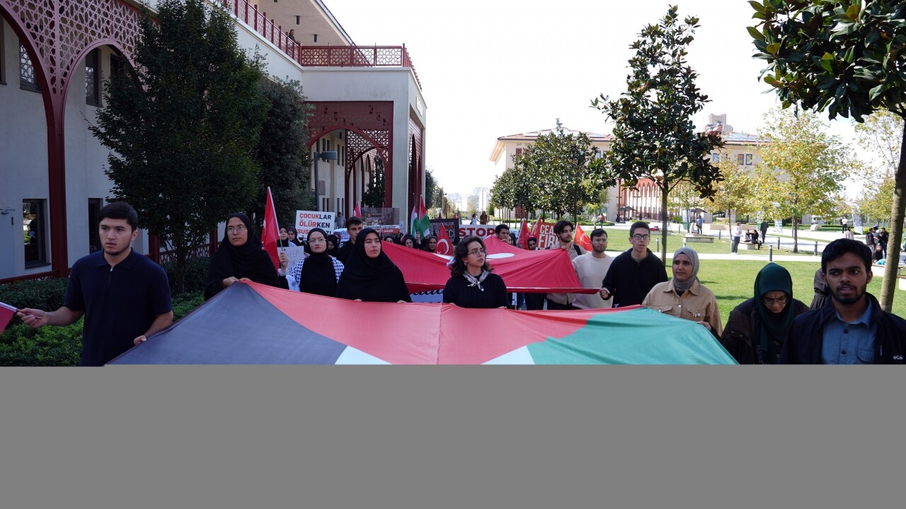 Daha sonra ellerinde Filistin bayraklarıyla yürüyüşe geçen öğrenciler, basın açıklaması yaptı.