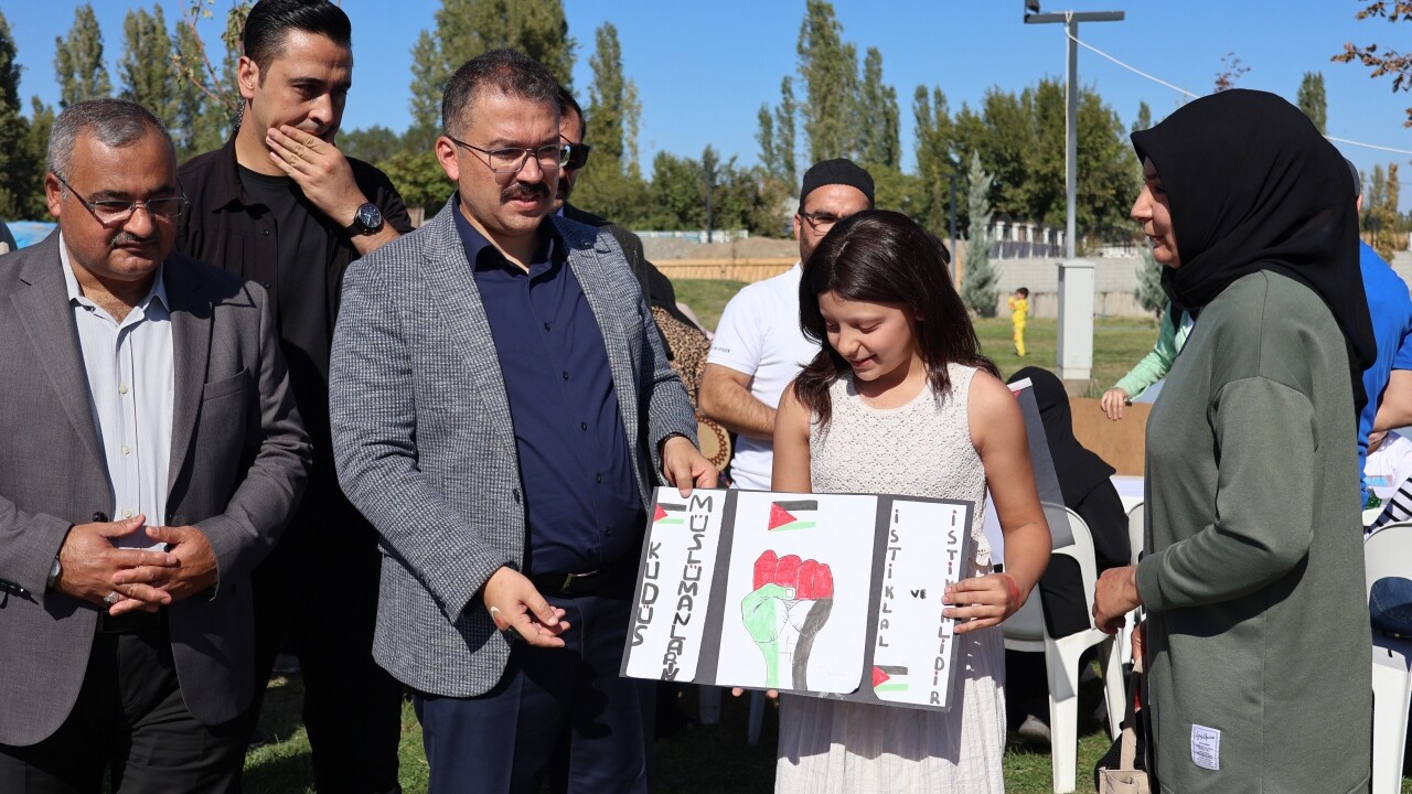 Valilik, Yetim Vakfı ve İHH tarafından Iğdır Millet Bahçesi'nde düzenlenen etkinlikte, yere serilen rulo kağıtlara çocuklar ve katılımcılar Gazze’ye destek veren resimler çizdi, duygularını anlatan yazılar yazdı.
