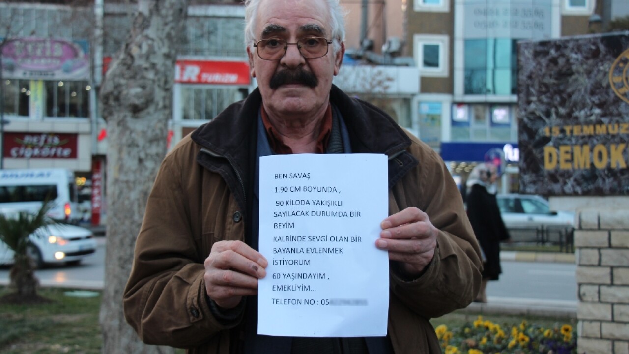 Elazığ’da yalnız yaşayan 60 yaşındaki memur emeklisi Savaş Savur, hazırladığı ilanla mutluluğu yakalayacağı eşini arıyor.