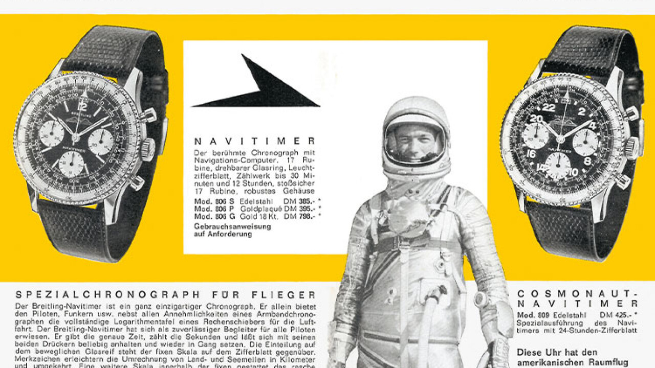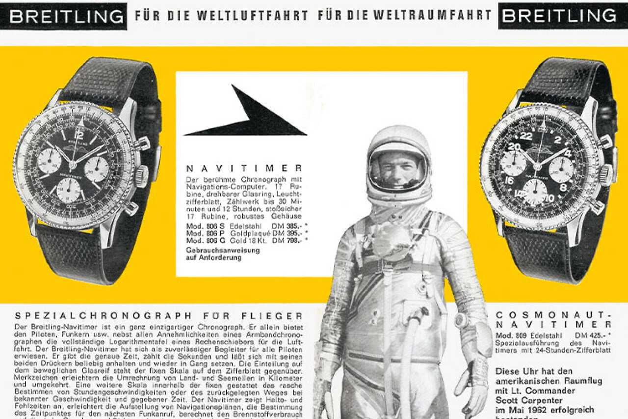 1962’de Mercury Seven astronotu Scott Carpenter, Breitling’e benzersiz bir talepte bulundu: Uzay keşfi için Navitimer’ın tasarımını değiştirmek. Modelin sayısal becerisine hayranlık duyan Carpenter, yörüngede geceyi gündüzden ayıracak 24 saatlik bir kadrana ihtiyaç duydu. Breitling bu zorlu işe girişti ve sonradan Cosmonaute adı verilen kişiselleştirilmiş Navitimer, 24 Mayıs 1962’de Carpenter’a uzaydaki görevinde eşlik eden ilk İsviçre menşeli ilk kol saati oldu.