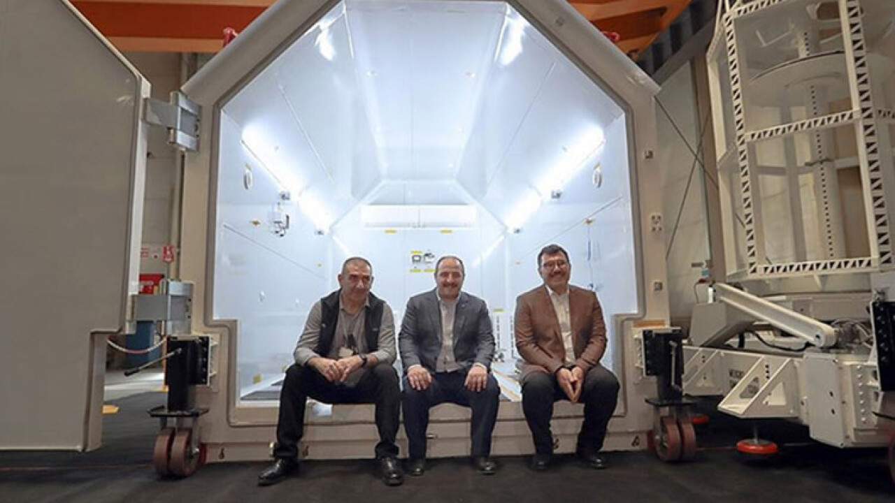 "Biliyorsunuz uyduların çok özel şartlarda uzaya fırlatılmadan önce saklanması gerekiyor. Bütün üretim faaliyetleri temiz odada gerçekleşiyor. Dolayısıyla hem uyduyu her türlü etkenden koruyacak hem de temiz oda şartlarını sağlayacak şekilde kendi iklimlendirme sistemi olan ve her türlü darbeye, basınca karşı uyduyu koruyacak bu kabin ortaya çıkmış oldu. 14 ay gibi kısa bir sürede firmamız hem bu makineyi üretti hem de arkamızda gördüğünüz taşıma kabinini üretti. Her zaman vurgu yapıyoruz, Türkiye yatırım, üretim, istihdam ve ihracatla büyümeyi önceleyen bir modele geçmek için büyük bir gayret sarf ediyor. Bu işlerin temelinde tabii ki katma değer geliyor. Katma değere ulaşabilmenin yolu da tasarımdan ve Ar-Ge'den geçiyor. İşte klasik olarak mobilya sektöründe düşündüğümüz bir firma kendi mühendisleri ve teknisyenleri ile kendi tasarımıyla uydu taşıyabilecek arkamızda gördüğünüz yüksek teknolojili bir kabini üretmiş oldu."
