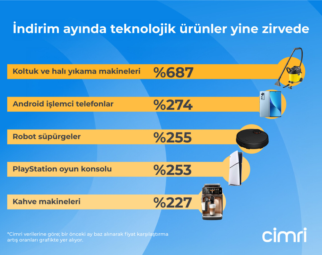 Cimri verilerine göre, koltuk ve halı yıkama makinelerinin fiyatları, bir önceki aya göre yüzde 687 oranında daha fazla karşılaştırıldı. Bunun yanında Android işlemci telefonlar yüzde 274, robot süpürgeler yüzde 255, PlayStation oyun konsolunun fiyat karşılaştırmaları da yüzde 253 oranında artış gösterdi. Kahve severler de kasım ayını boş geçmedi. Kahve makinelerinin fiyat karşılaştırmaları de bir önceki aya göre yüzde 227 oranında artarak, en çok karşılaştırılan ürünler arasında yer aldı.