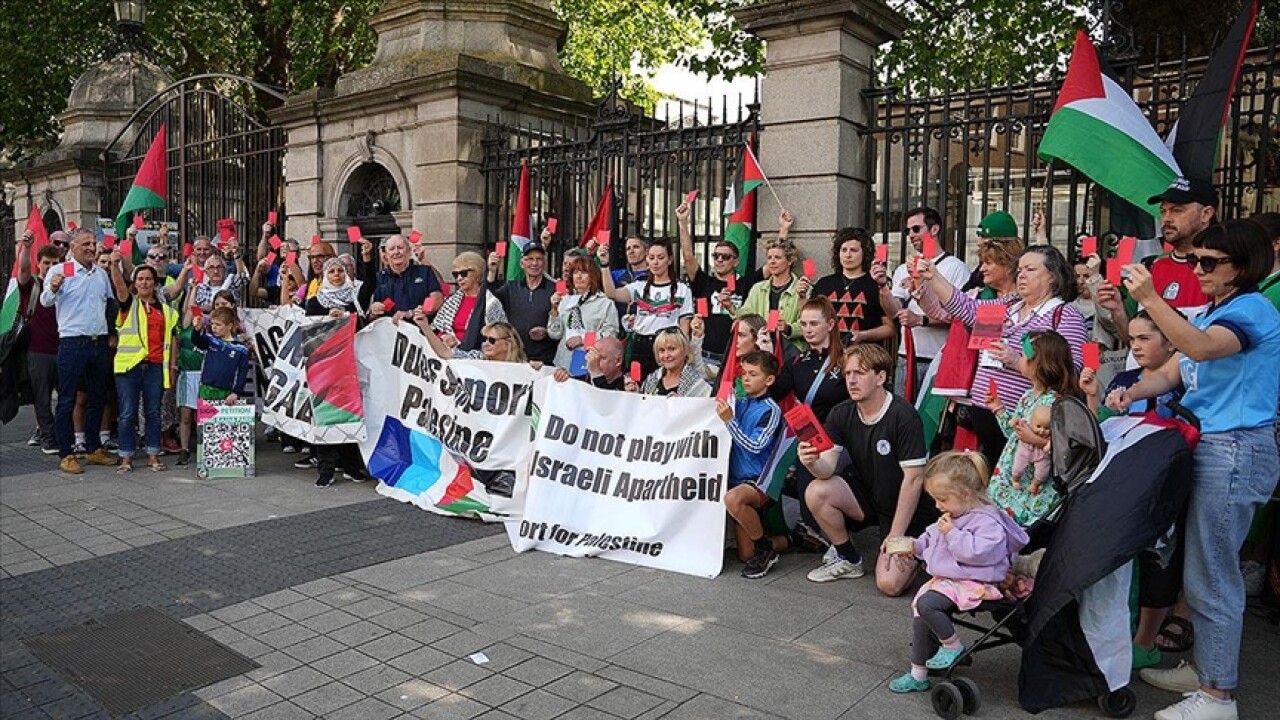 Filistin İçin İrlanda Sporu Derneği tarafından İrlanda Parlamento binasının önünde düzenlenen gösteriye onlarca kişi katıldı.