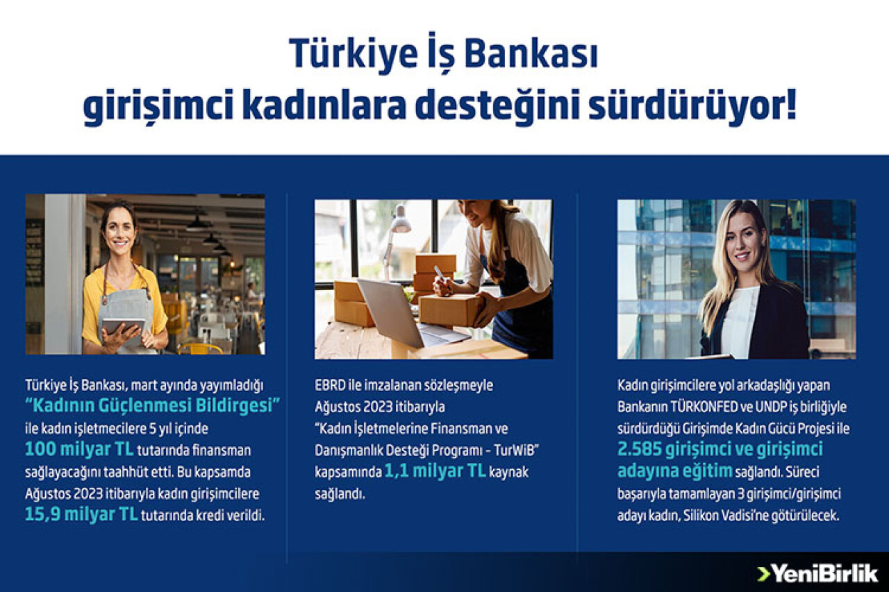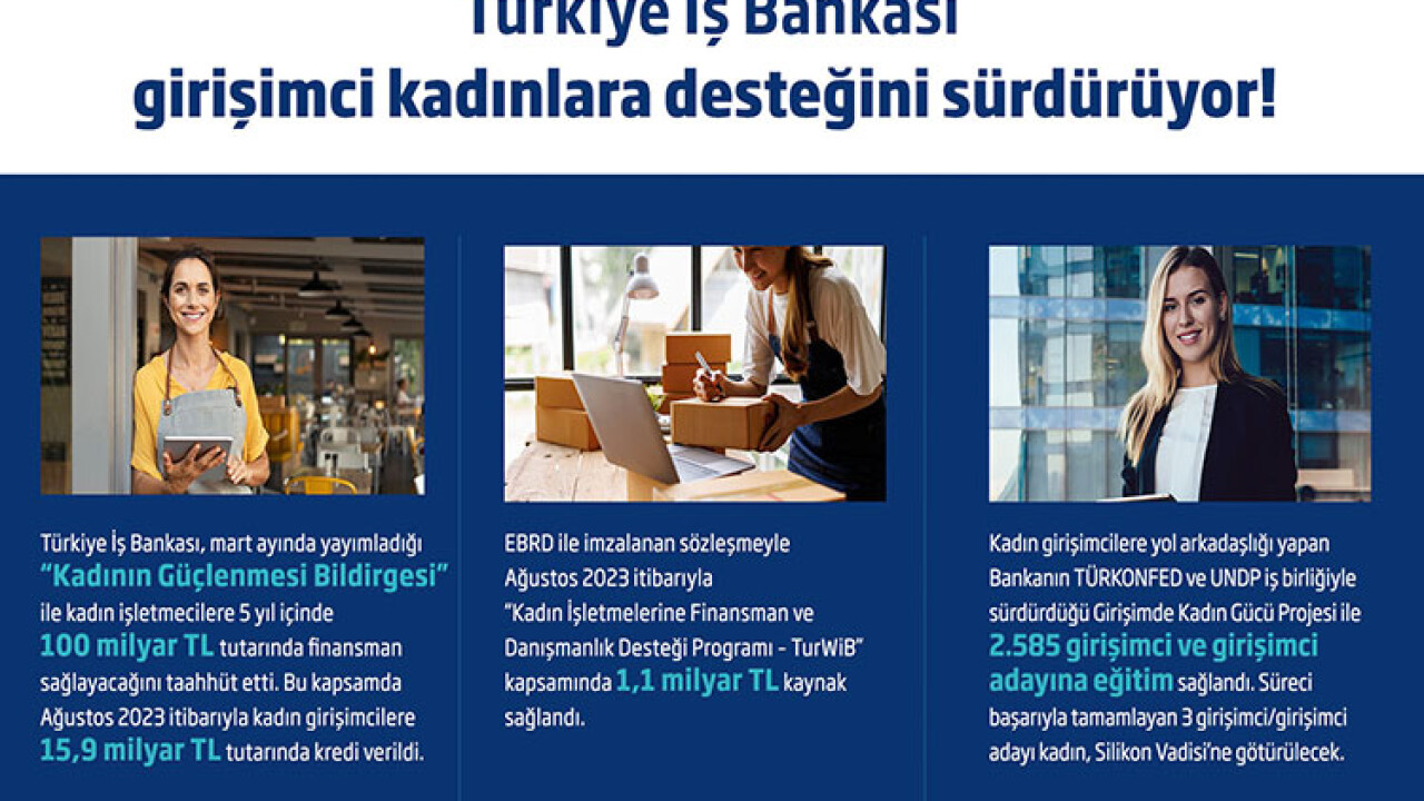 Banka, Avrupa İmar ve Kalkınma Bankası (EBRD) ile imzaladığı sözleşmeyle, “Kadın İşletmelere Finansman ve Danışmanlık Desteği Programı-TurWiB” kapsamında sağladığı 76 milyon dolar kaynağı, Ağustos 2022’den itibaren 18 ay içinde belirlenen kriterlere uygun müşterilere kullandırıyor. İş Bankası, bu sözleşme ile 2023 Ağustos ayı itibarıyla kadın işletmelere 1,1 milyar TL kaynak sağladı.