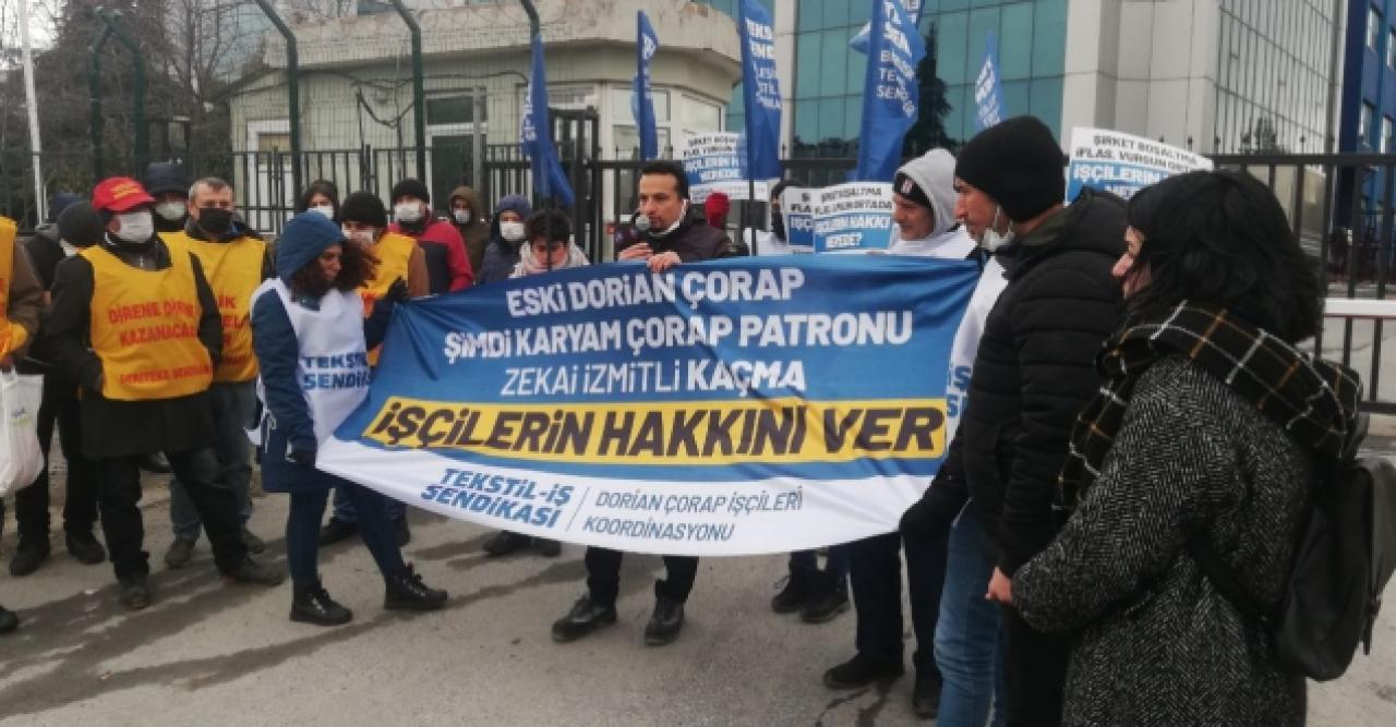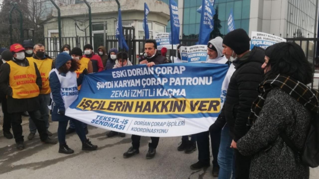 10 yıl önce işten çıkarılan 13 işçi, ödenmeyen ücret ve tazminatlarını alabilmek için açtıkları davayı kazandı. İşçiler, şu anda faaliyetlerini Karyam Çorap üzerinden ilerleten fabrika önünden bir kez daha seslendi. Açıklamada konuşan işçilerden Erol Körsülükoğlu şöyle konuştu: “Dorian Çorap’ı Karyam yaptı. Biz bunu mahkemelerde kanıtladık. Biz Karyam’a hacze gittik. Çorap aldık, iplik aldık. Haczettiğimiz mallara itiraz etti ve bu mallar masraflara gitti. Biz hakkımızı, maaşımızı mesaimizi kıdemimizi alamıyoruz. Kıdem tazminatı işçinin hakkıdır. Bu kıdem tazminatı patronların niye zoruna gidiyor? Haciz de çözüm olmuyor, ipini alıyoruz masraflara gidiyor. Zekai İzmitli’de diyor ki, malzemem çöp olsun, işçilere gitmesin diyor. Bu işçiler sana para kazandırmaktan başka ne yaptı? Biz sadece çalıştık, patrona bir şey yapmadık. Burada 8-10 yıl çalışan işçiler var. Kıdem tazminatımızı, çoluk çocuğumuzun hakkını istiyoruz.”Tekstil-İş Örgütlenme Koordinasyonu Üyesi Ferhan Yılmaz da Dorian işçilerinin 10 yıl önce haksız yere işten çıkarıldığını hatırlatarak “Buradan Çalışma Bakanlığı’na da seslenmek istiyoruz. Bu şirketlerin patronları nasıl oluyor da bu kadar rahat bu firmaların içini boşaltabiliyor. Ticaret Bakanlığı’na da sesleniyoruz: Bunların ticari işleri sizlerin önünden geçiyor. Adalet Bakanlığı’na da sesleniyoruz: Bu işçiler o kadar dava kazanmışken, çoraplara ipliklere haciz koymayı başarmışken o işçilerin haciz koymayı başardığı çorapları haciz depolarının kiralarını nasıl alıyorsunuz?”