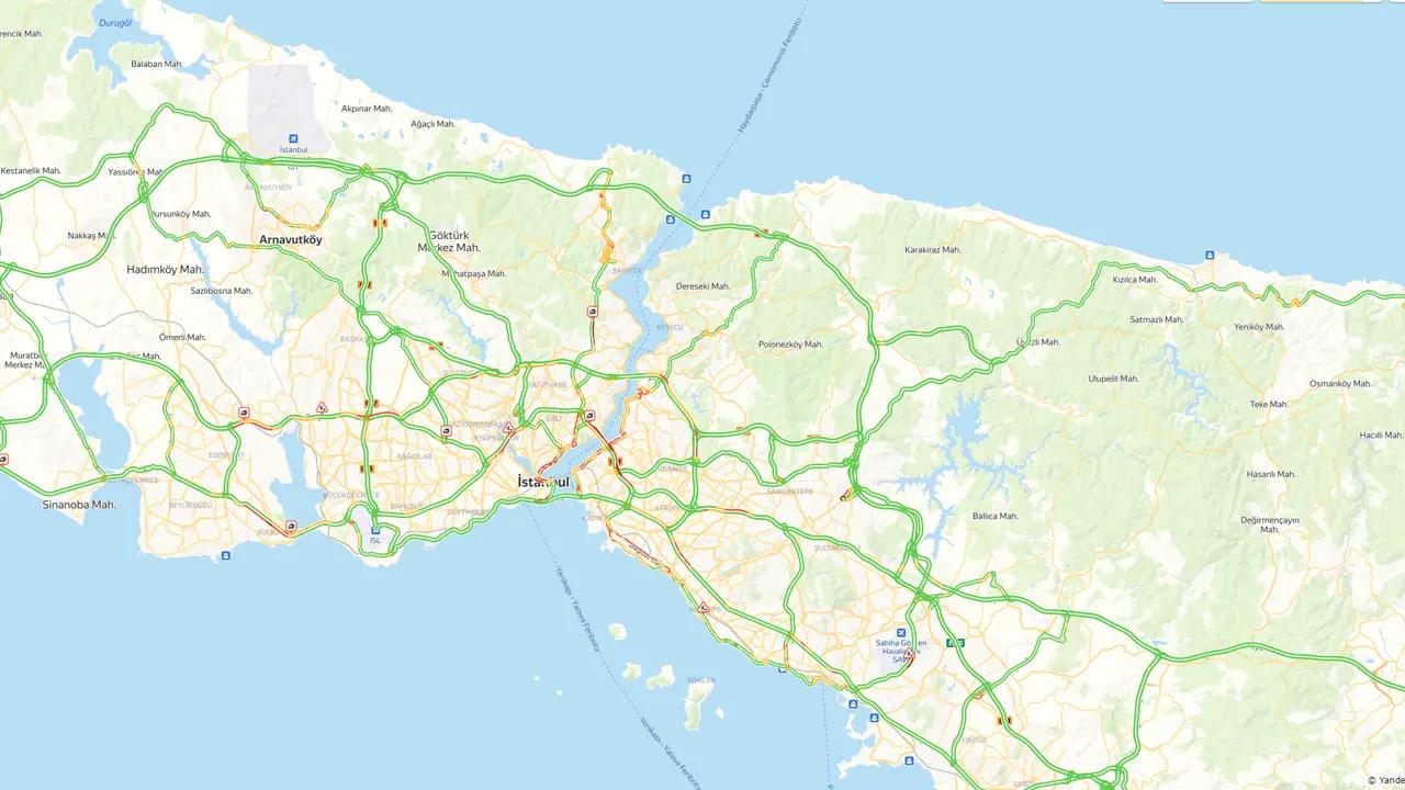 Haberin yazıldığı dakikalarda İstanbul'daki trafikte oran yüzde 35 olarak gözüküyor. Birçok ana arter ve E-5 noktasında yok denebilecek kadar bir yoğunluk söz konusu. 15 Temmuz Şehitler Köprüsü'nden Avrupa yakasına geçiş tarafında trafik var. Aynı durum Eminönü ve Beşiktaş'ta da var.