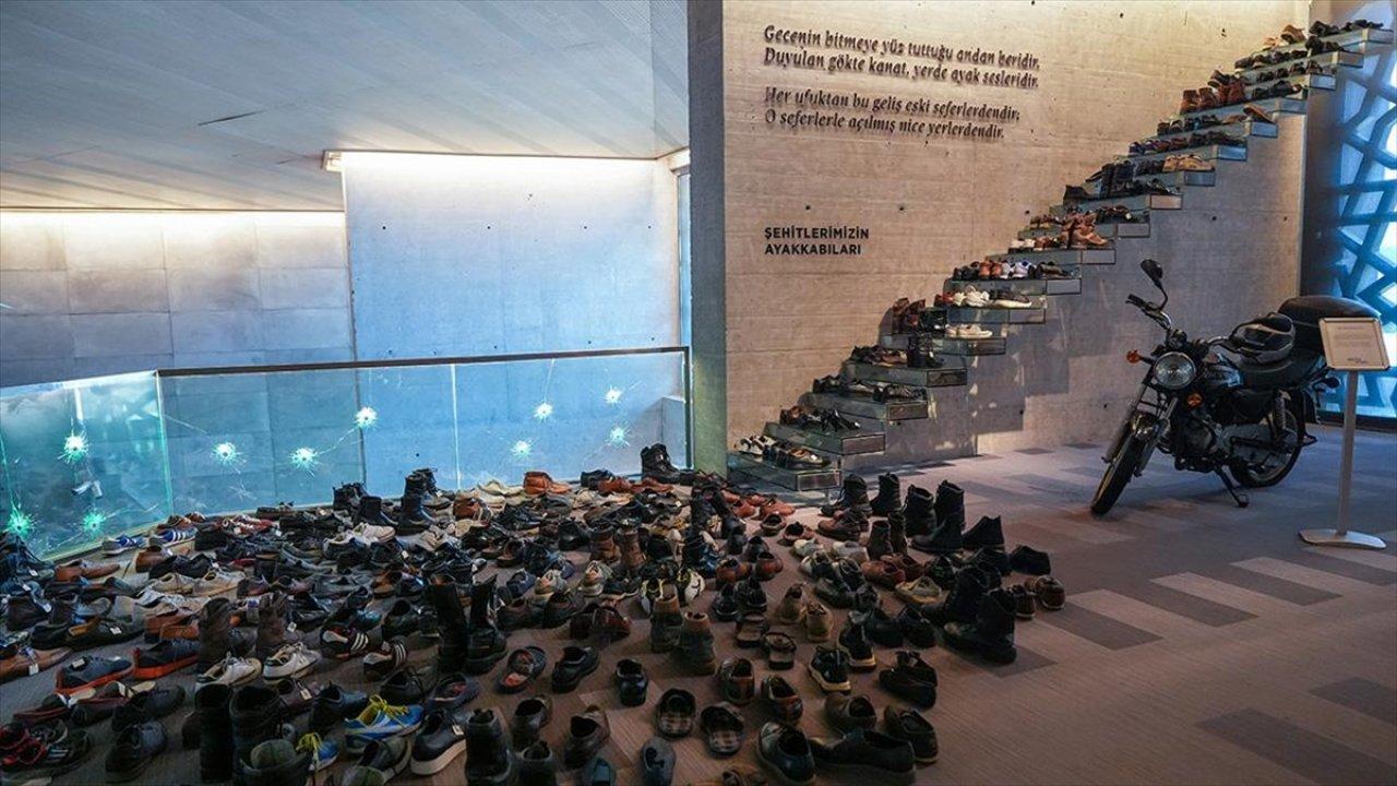 "15 Temmuz gecesinde, Genelkurmay Başkanlığı'nın önünde tankın ezdiği sivil bir aracı o geceki haliyle sergiliyoruz. Şu an önünde de durduğumuz yerde şehitlerimize ait ayakkabılar var. Bunlar şehitlerimizin kendi kullandıkları ayakkabılar. İlçe ilçe, köy köy dolaşılarak, ailelerinin teslim ettiği ayakkabılar. Tamamı şehitlerimize ait, 32 tanesi şehitlerimizin o gece ayağında olan ayakkabılar. Bunun yanı sıra şehit Ömer Halisdemir'in beresi ve kaması var. O gece vatandaşa karşı kullanılan kurşunların boyutunu gösteren bir vitrinimiz var. Yine o günün simge objelerinden, Cumhurbaşkanımız Recep Tayyip Erdoğan'ın vatandaşları sokaklara çağırmasına vesile olan gazeteci Hande Fırat'ın cep telefonu var. Bunlar dışında şehit ve gazilerimize ait olan, o gece de kullanılan motosiklet ve kask da yer alıyor. Ayrıca şehit ve gazilerimize ait cep telefonu, cüzdan ve anahtar gibi objeleri sergiliyoruz."