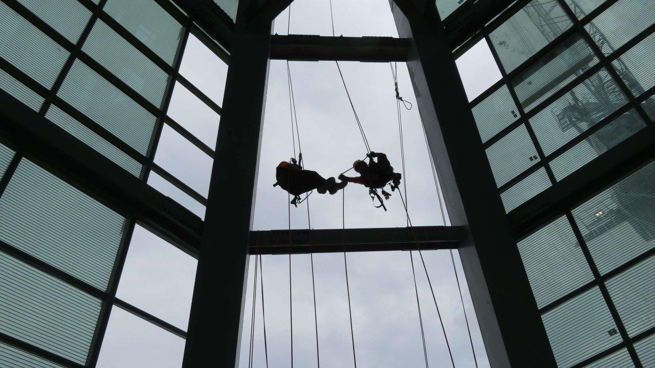 İstanbul Finans Merkezi'ndeki inşaat çalışmalarında sona gelinen Merkez Bankası binasının panel ve camları, 40 kişilik endüstriyel dağcı bir ekip tarafından takılıyor. Şimdiye kadar bin 150 panel camdan 900'ünü takan dağcılar, 353 metrede zorlu rüzgara rağmen çalışmalarını titizlikle sürdürüyor.