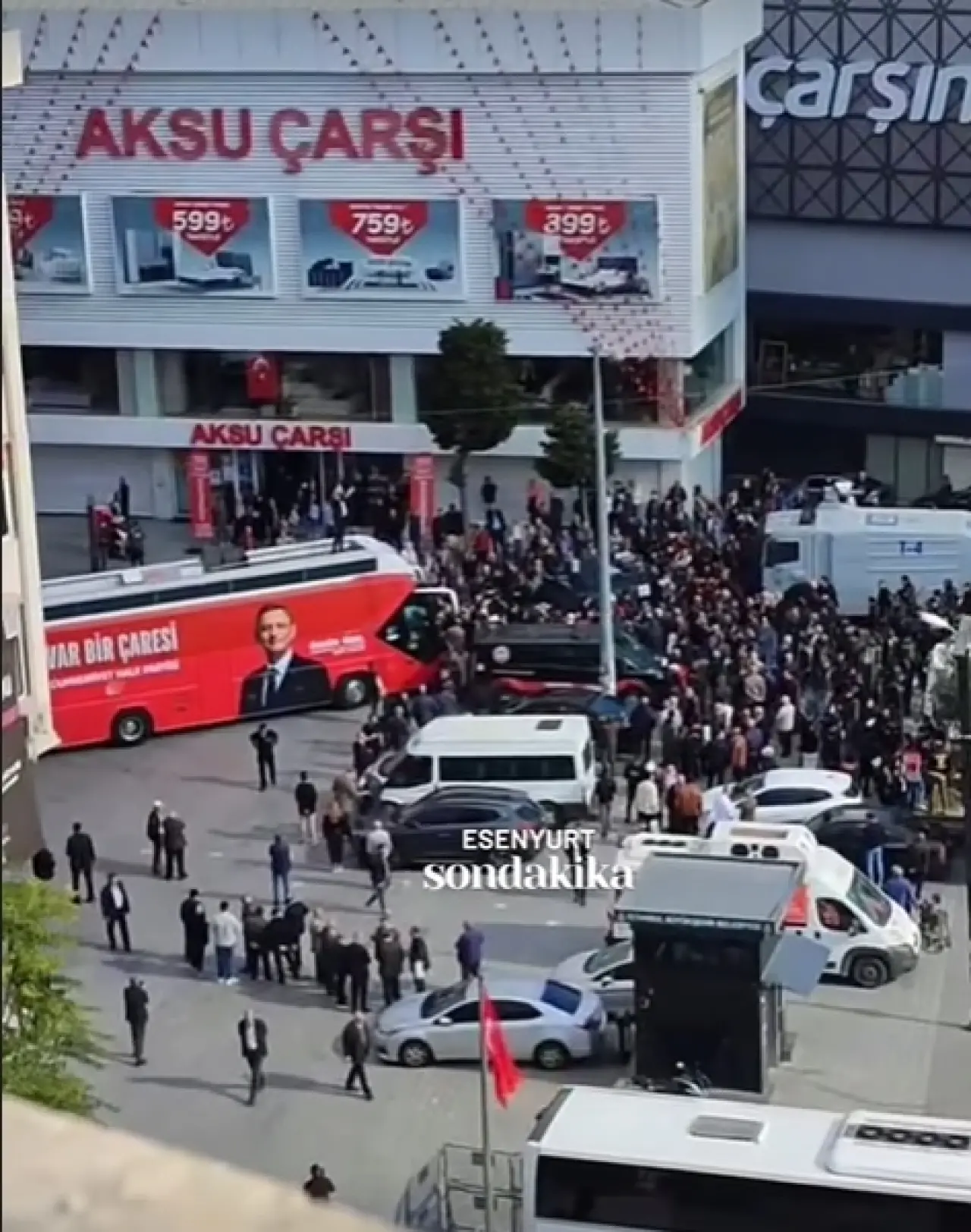 Esenyurt Meydanı'nda yaşanan gerilim hala devam ederken CHP otobüsünün önünde çok sayıda polis ekibi sevk edildi. Olayla ilgili Esenyurt halkı miting alanında toplanmaya başladı.
