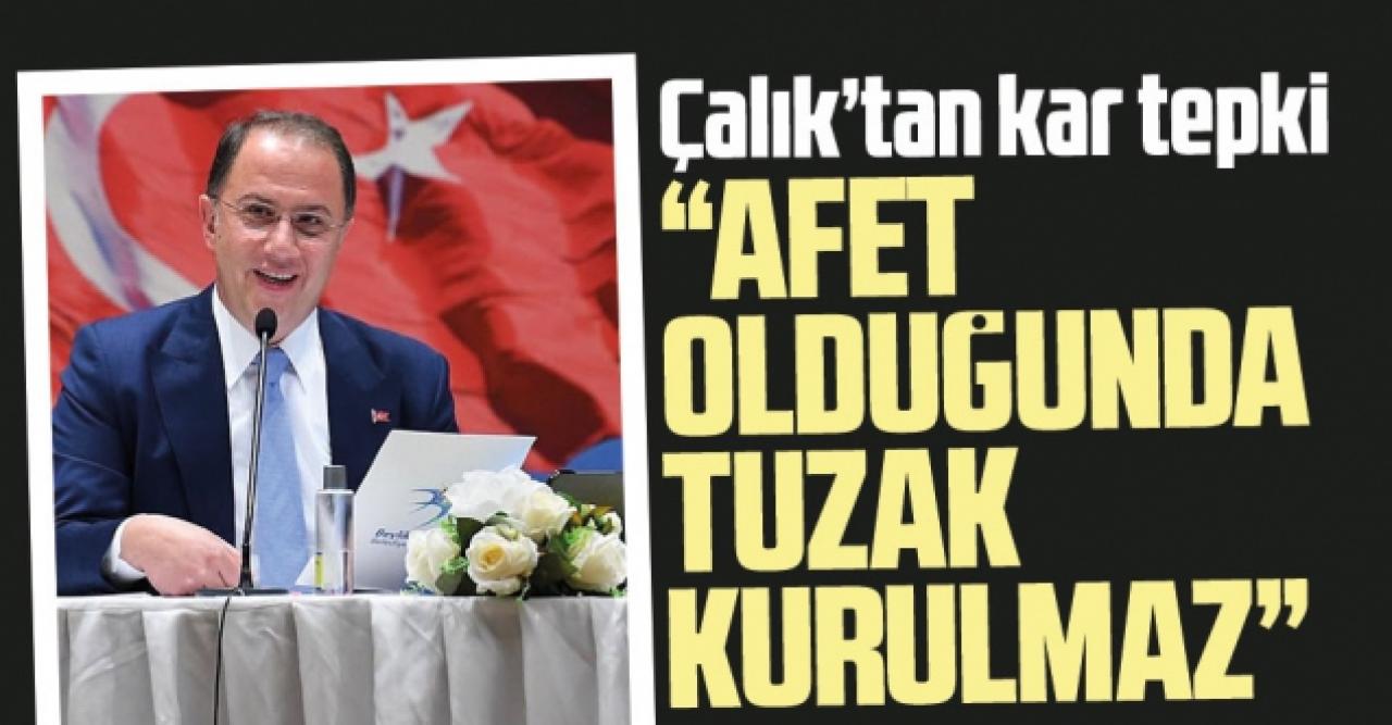 “Tüm bunlar yaşanırken üzülerek belirtmek isterim ki afet anını siyasi puan alma mecrasına çekenler de vardı” diyen Çalık, “İstanbul'a gelen yollar kapanmışken, kar uyarılarına rağmen tam kar yağışı başladığı anda kamu çalışanlarının mesaisine son verilmişken, havalimanında 20-25 bin insan mahsur kalmışken, özellikle İBB ve CHP'li belediyeler çalışmıyormuş gibi göstermeye çalışmak gerçekten üzücüdür. Tolumsal değerlerimizin ne kadar hızlı bir şekilde yok edildiğinin farkındasınız. Hepimizin sorumlulukları var. Sorumluluklarımızın bilincindeyiz. Tabi afetler karşısında acizliğimizin de farkındayız. Afetler ayrışma zamanı değil dayanışma zamanıdır. Tuzak kurma zamanı değildir. Devletin suçluları bulmak için kurduğu sistemlerle siyasileri takip edilmez. Bu kurumların hepsi bizimdir” eleştirisinde bulundu.