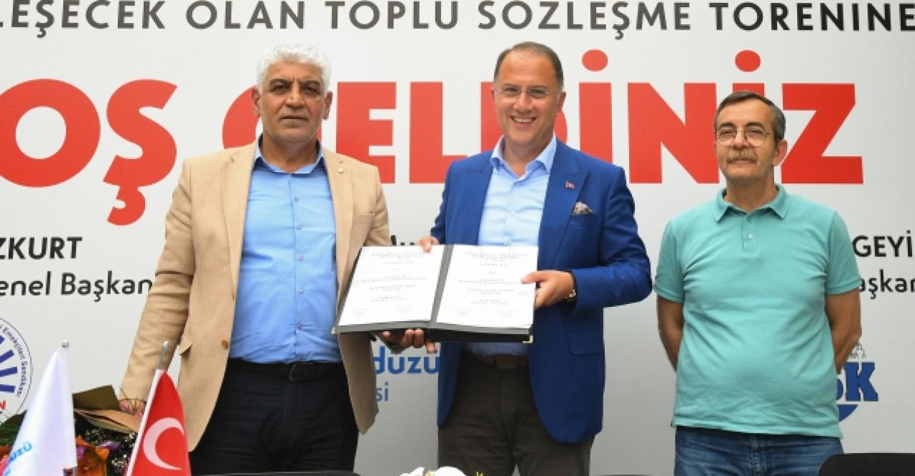 Beylikdüzü Belediyesi, KESK’e bağlı Tüm Belediye ve Yerel Yönetim Emekçileri Sendikası (Tüm-BEL-SEN) ile Toplu İş Sözleşmesine imza attı. Belediye binası bahçesine gerçekleşen törene Beylikdüzü Belediye Başkanı Mehmet Murat Çalık, Tüm BEL-SEN Genel Başkanı Erdal Bozkurt ve Tüm-BEL-SEN 1Nolu Şube Başkanı İbrahim Sönmez’in yanı sıra başkan yardımcıları, birim müdürleri ve emekçi belediye personelleri katıldı. Genel Başkan Bozkurt, toplu sözleşme imza töreni öncesinde yaptığı konuşmada, Beylikdüzü’nün emek mücadelesinde ayrı bir yeri olduğunu belirterek, “Ekrem Başkanla başlayan süreçte Beylikdüzü’nde iş gücü mesele olduğunda bunun pazarlık konusu dahi yapılamayacağı bir gelenek olarak oturtulmuş. Bugün de Beylikdüzü’nde Murat Başkan’la bu sürecin devam etmesi hepimize büyük mutluluk veriyor. Toplu sözleşmede emeği geçen ve komisyonda olan herkese teşekkür ediyorum.” ifadelerini kullandı. Şube Başkanı Sönmez ise burada yaptığı konuşmada, kamu emekçilerinin ekonomik şartlarını düzelten bir sözleşme olduğunu ifade ederek, imzalanan toplu sözleşmenin önemine vurgu yaptı.
