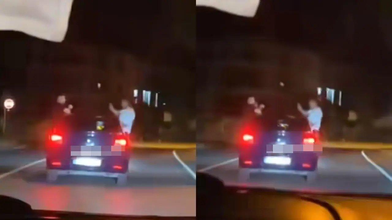 Gece saatleri yaşanan olayda araçtan sarkarak eğlenen iki arkadaşın o anları cep telefonu kamerasına saniye saniye yansıdı. Gençlerin tehlike dolu yolculuğunda şans eseri herhangi bir kaza meydana gelmedi.