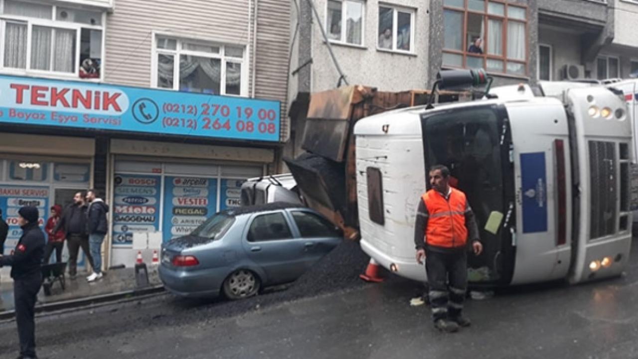 Gaziosmanpaşa'da asfalt yüklü bir kamyon otomobilin üzerine devrilerek korku dolu anlar yaşattı.