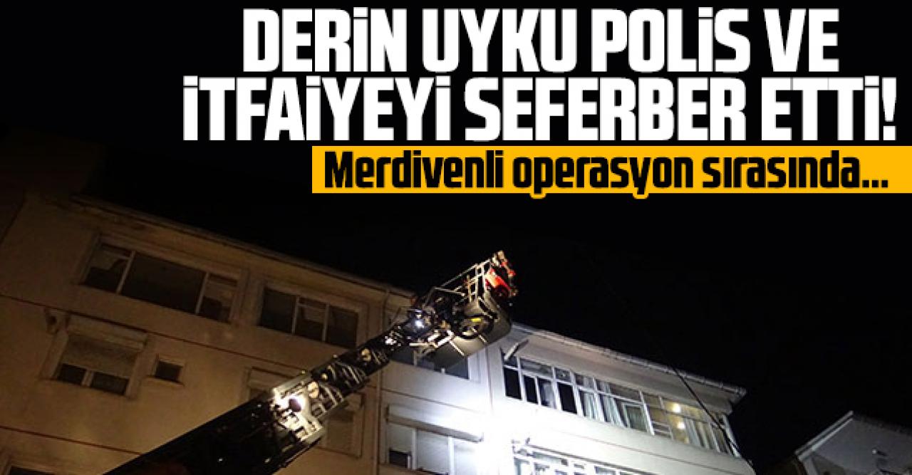 Denizköşkler Mahallesi'ndeki Güzel Sokak'ta oturan Derin Ö. dün akşam bir yakınını ziyarete giderken, 4 yaşındaki kızını Sinan Ö.'nün yanında bıraktı. İşten yorgun gelen adam cep telefonunu oynaması için kızına verirken televizyonun karşısında uyuya kaldı. Küçük kız telefon şarjının bitmesi üzerine uyudu. 6'ncı kattaki eve gelen kadın kapı mandalının kilitli olması nedeniyle içeri giremedi. Cep telefonuna da ulaşamayan Derin Ö. kapıyı sürekli çalması ve gürültü çıkarmasına rağmen eşini uyandıramadı. Kızının gece veya sabah uyanınca açık pencereden düşmesinden endişe ettiğini belirten kadın saat 23.30 sıralarında itfaiyeyi aradı. 30 metrelik merdiven aracı ile gelen ekip, polis olmadan binaya pencereden girilemeyeceğini bildirdi. İhbar üzerine Avcılar Emniyet Müdürlüğü ekibi de bölgeye geldi. İtfaiye erlerinden biri araçtaki merdivenle pencerenin önüne ulaşırken gürültü üzerine Sinan Ö. uyanınca 'Merdivenli operasyondan' vazgeçildi. Olanları öğrenince şaşıran Sinan Ö. polis ve itfaiye görevlilerine uykusunun genellikle çok hafif olduğunu ancak, bu akşam uyanamadığını belirtirken, eşi kızı için endişelendiğini söyledi. DHA