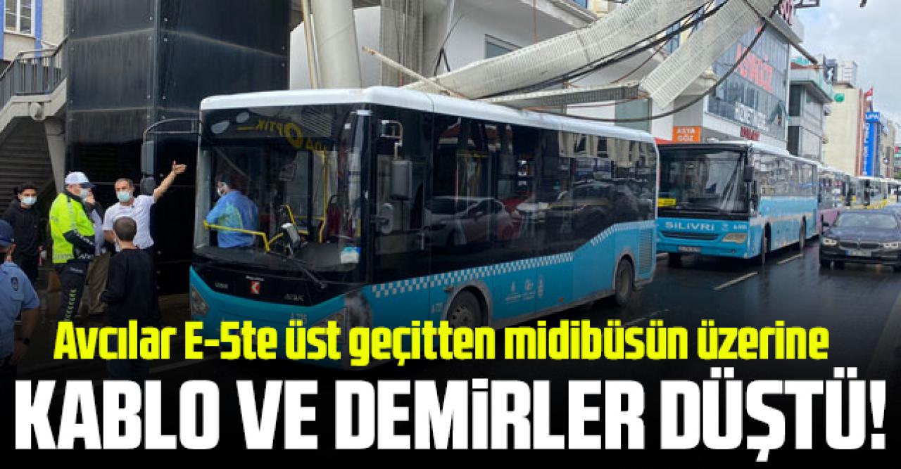 D-100 karayolu Avcılar mevkiinde yolcu midibüsünün üzerine üst geçide bağlı olan kablo ve demirler düştü.