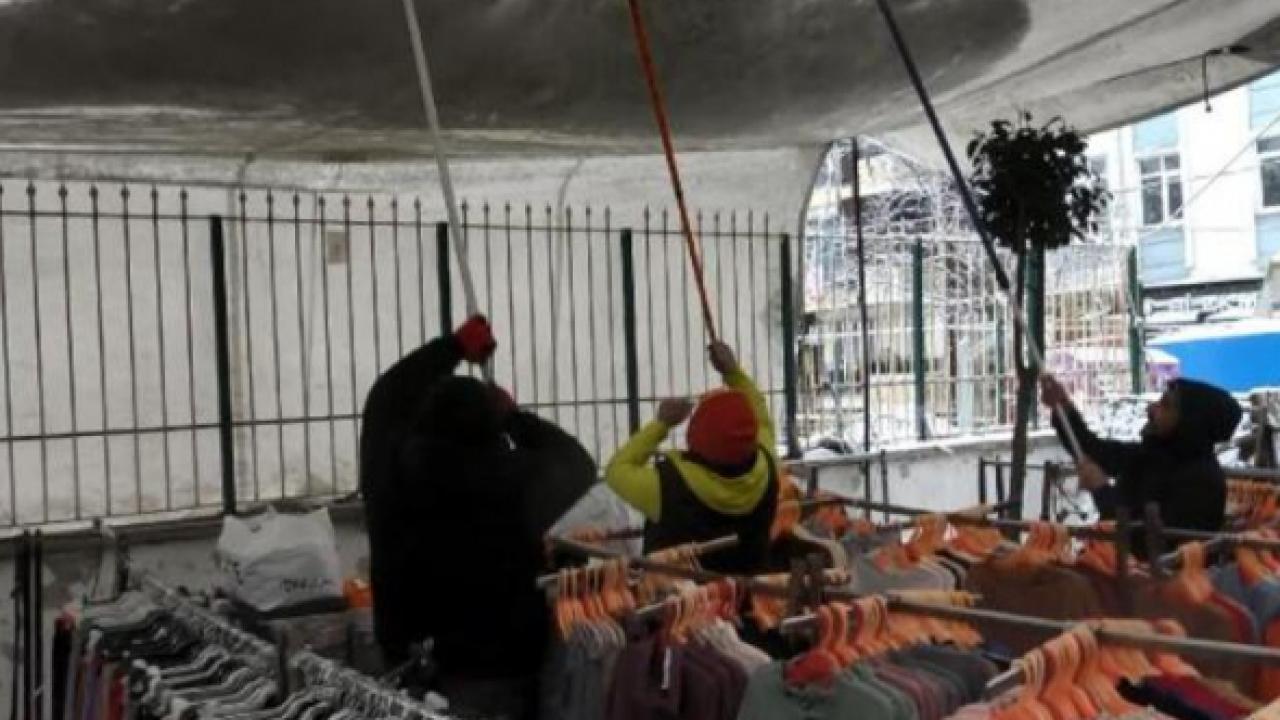 İstanbul'da etkisini gösteren kar yağışı pazarcılara da zor anlar yaşattı. Avcılar'da bir anda bastıran kara karşı olarak tezgahlarını yeni açan pazarcılar, brandaların üzerini temizlemek için sopalarla sık sık müdahale etmek zorunda kaldı.